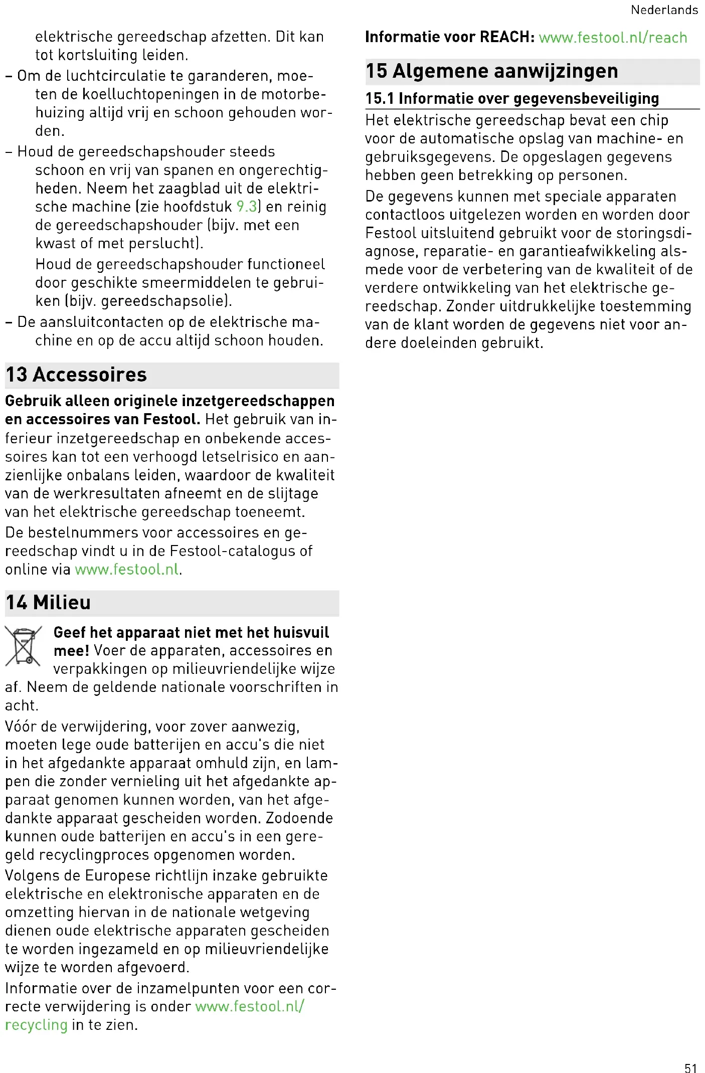 – Efter bearbetning av metall: blås ur el verktyget invändigt genom ventilations öppningarna med torr och oljefri tryckluft. Annars kan ledande damm avsättas inuti elverktyget. Det kan leda till kortslutning. – För att luftcirkulationen ska kunna garan teras, måste kylluftöppningarna i motorns hölje alltid hållas öppna och rena. – Håll alltid verktygsfästet fritt från spån och främmande föremål. Ta ut sågbladet ur el verktyget (se kapitel 9.3) och rengör verk tygsfästet (t.ex. med en pensel eller tryck luft). Håll verktygsfästet i gott skick genom att använda lämpligt smörjmedel (t.ex. verk tygsolja). – Håll alltid anslutningskontakterna på el verktyget och batteriet rena. 13 Tillbehör Använd endast originalinsatsverktyg och till behör från Festool. Användning av undermåli ga insatsverktyg och tillbehör från andra tillver kare kan leda till ökad risk för personskador och kraftig obalans som försämrar kvaliteten på arbetsresultaten och ökar slitaget på elverk tyget. Beställningsnumren för tillbehör och verktyg hittar du i din Festool-katalog eller på internet under www.festool.se. 14 Miljö Släng inte maskinen i hushållssoporna! Se till att verktyg, tillbehör och förpack ningar lämnas till miljövänlig återvin ning. Följ den nationella föreskrifterna. Före avfallshanteringen ska, om sådana finns, gamla batterier som inte omges av ett verktyg samt lampor som kan tas ut utan att skadas, avlägsnas från det uttjänta verktyget. Då kan de gamla batterierna återvinnas på rätt sätt. Enligt EU-direktivet om uttjänt el- och elektro nikutrustning och omsättning till nationell lag stiftning måste förbrukade elverktyg källsorte ras och återvinnas på ett miljövänligt sätt. Information om insamlingsstationer för korrekt avfallshantering finns på www.festool.se/ recycling. Information om REACH: www.festool.se/reach 15 Allmänna anvisningar