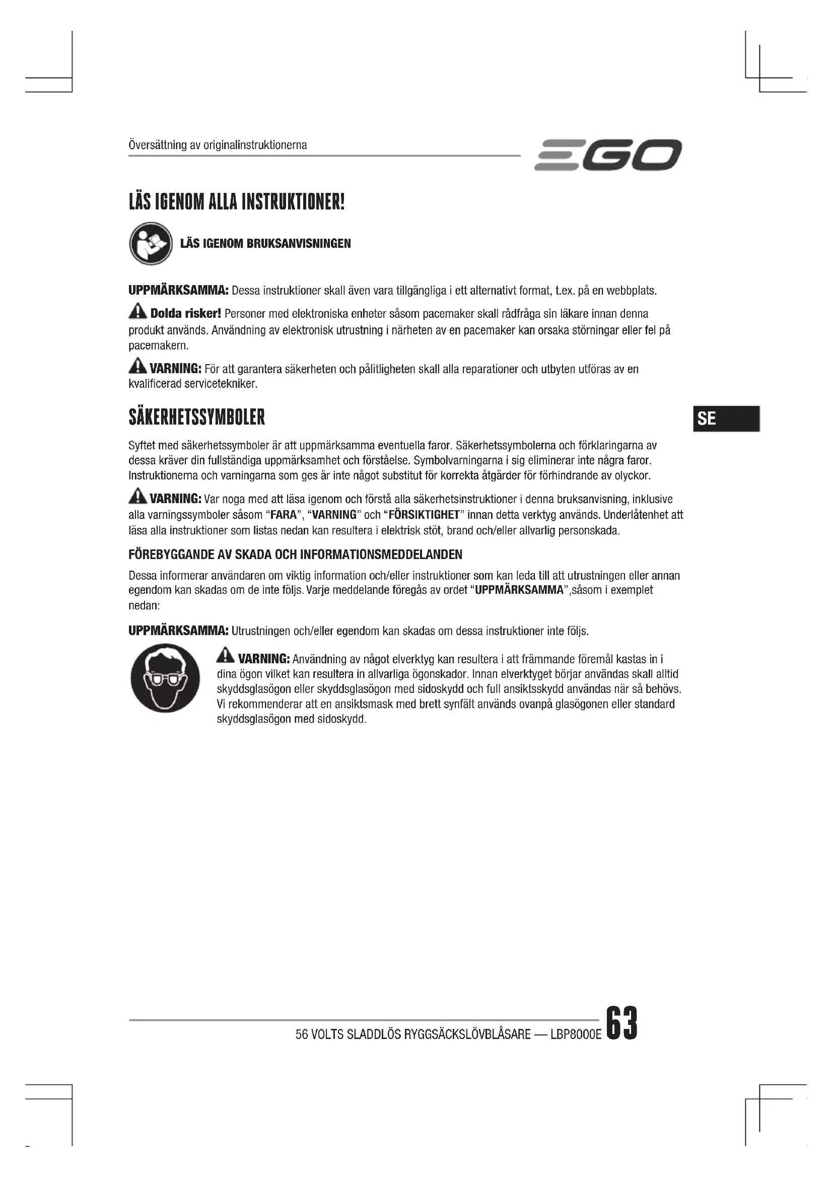 Dessa informerar användaren om viktig information och/eller instruktioner som kan leda till att utrustningen eller annan egendom kan skadas om de inte följs. Varje meddelande föregås av ordet “UPPMÄRKSAMMA”,såsom i exemplet nedan: UPPMÄRKSAMMA: Utrustningen och/eller egendom kan skadas om dessa instruktioner inte följs. VARNING: Användning av något elverktyg kan resultera i att främmande föremål kastas in i dina ögon vilket kan resultera in allvarliga ögonskador. Innan elverktyget börjar användas skall alltid skyddsglasögon eller skyddsglasögon med sidoskydd och full ansiktsskydd användas när så behövs. Vi rekommenderar att en ansiktsmask med brett synfält används ovanpå glasögonen eller standard skyddsglasögon med sidoskydd. Översättning av originalinstruktionerna56 VOLTS SLADDLÖS RYGGSÄCKSLÖVBLÅSARE — LBP8000E64
