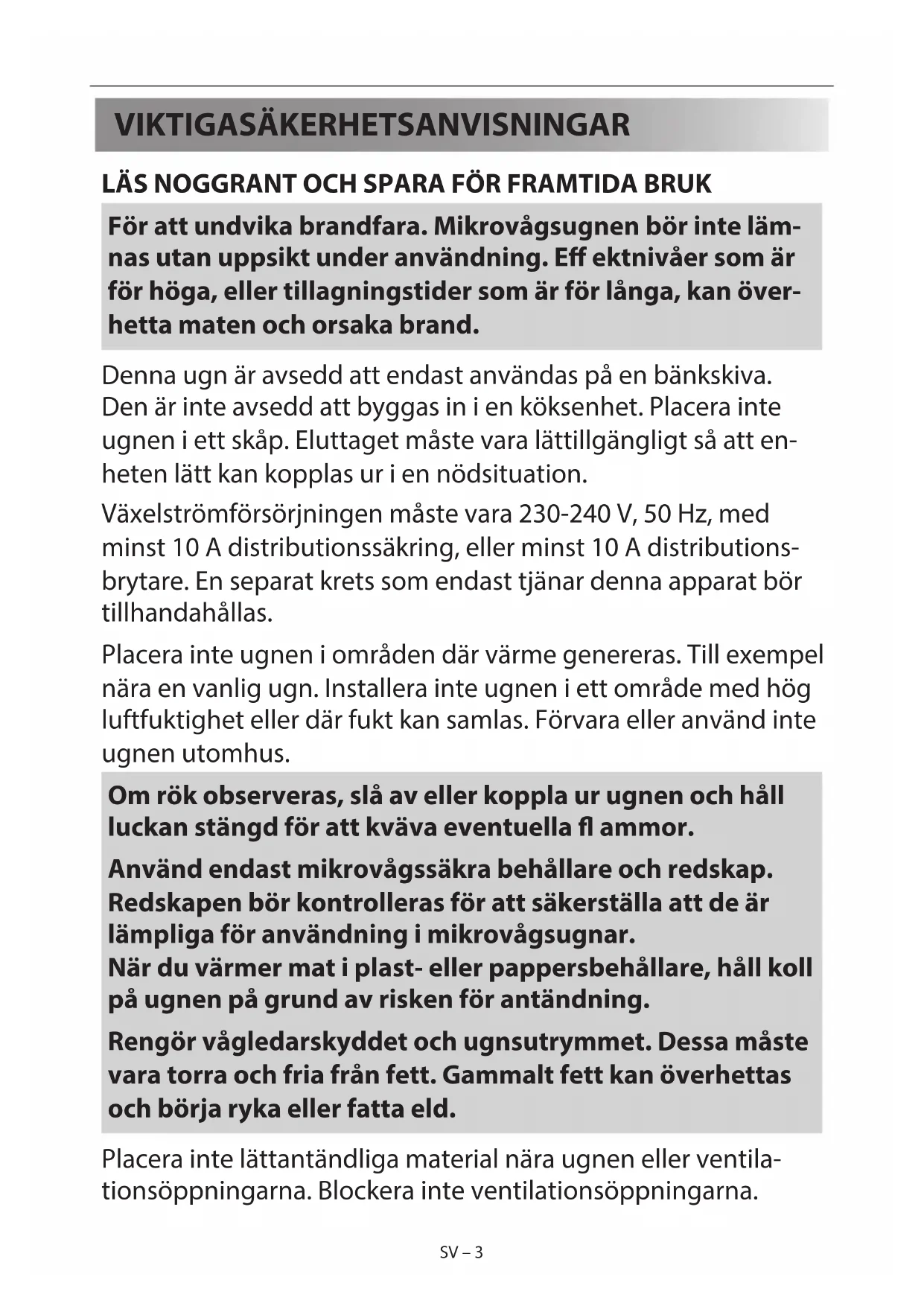 LÄS NOGGRANT OCH SPARA FÖR FRAMTIDA BRUK För att undvika brandfara. Mikrovågsugnen bör inte läm- nas utan uppsikt under användning. Eff ektnivåer som är för höga, eller tillagningstider som är för långa, kan över- hetta maten och orsaka brand. Denna ugn är avsedd att endast användas på en bänkskiva. Den är inte avsedd att byggas in i en köksenhet. Placera inte ugnen i ett skåp. Eluttaget måste vara lättillgängligt så att en- heten lätt kan kopplas ur i en nödsituation. Växelströmförsörjningen måste vara 230-240 V, 50 Hz, med minst 10 A distributionssäkring, eller minst 10 A distributions- brytare. En separat krets som endast tjänar denna apparat bör tillhandahållas. Placera inte ugnen i områden där värme genereras. Till exempel nära en vanlig ugn. Installera inte ugnen i ett område med hög luftfuktighet eller där fukt kan samlas. Förvara eller använd inte ugnen utomhus. Om rök observeras, slå av eller koppla ur ugnen och håll luckan stängd för att kväva eventuella ammor. Använd endast mikrovågssäkra behållare och redskap. Redskapen bör kontrolleras för att säkerställa att de är lämpliga för användning i mikrovågsugnar. När du värmer mat i plast- eller pappersbehållare, håll koll på ugnen på grund av risken för antändning. Rengör vågledarskyddet och ugnsutrymmet. Dessa måste vara torra och fria från fett. Gammalt fett kan överhettas och börja ryka eller fatta eld. Placera inte lättantändliga material nära ugnen eller ventila- tionsöppningarna. Blockera inte ventilationsöppningarna.SV SV – 3SV – 3