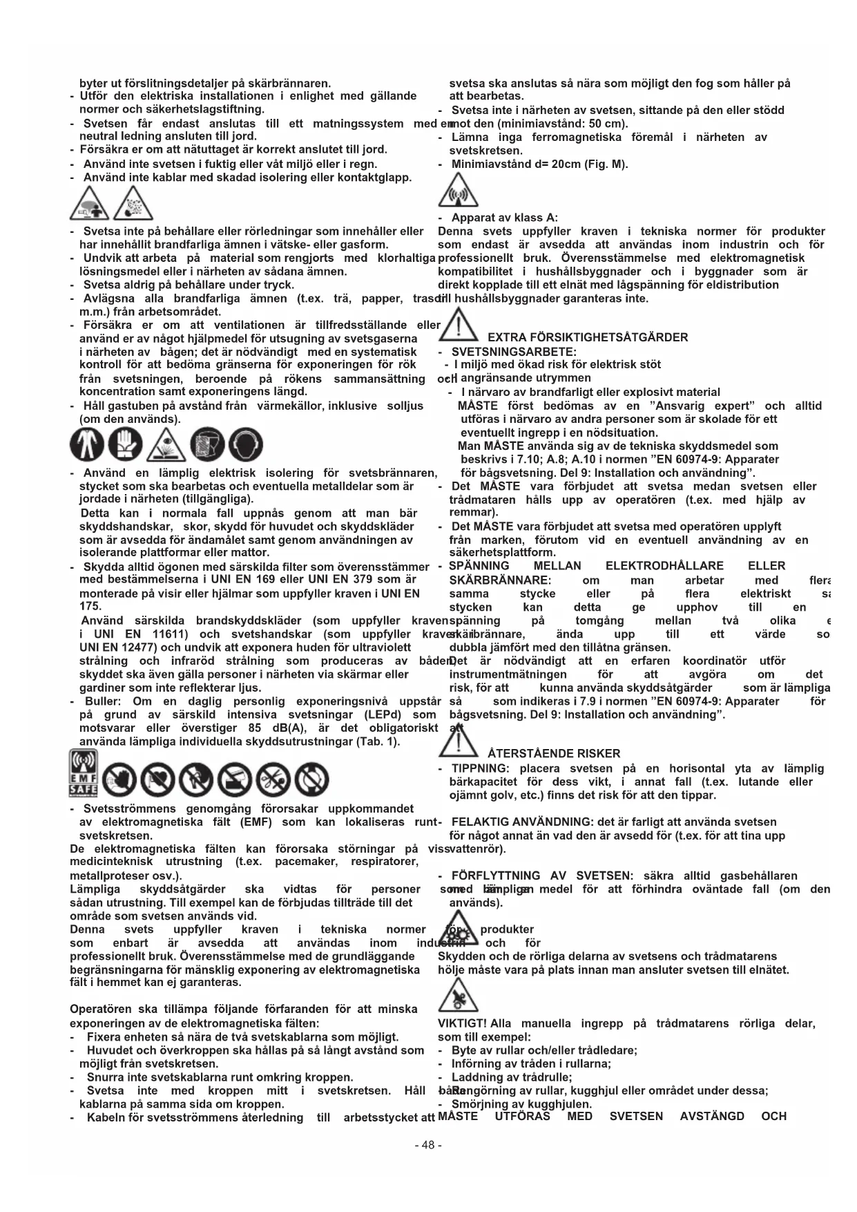 Använd särskilda brandskyddskläder (som uppfyller kraven i UNI EN 11611) och svetshandskar (som uppfyller kraven i UNIEN12477)ochundvikattexponerahudenförultraviolett strålning och infraröd strålning som produceras av båden; skyddetskaävengällapersonerinärhetenviaskärmareller gardinersomintereekterarljus. - Buller: Om en daglig personlig exponeringsnivå uppstår på grund av särskild intensiva svetsningar (LEPd) som motsvarar eller överstiger 85 dB(A), är det obligatoriskt att användalämpligaindividuellaskyddsutrustningar(Tab.1). - Svetsströmmens genomgång förorsakar uppkommandet av elektromagnetiska fält (EMF) som kan lokaliseras runt svetskretsen. De elektromagnetiska fälten kan förorsaka störningar på viss medicinteknisk utrustning (t.ex. pacemaker, respiratorer, metallproteserosv.). Lämpliga skyddsåtgärder ska vidtas för personer som bär en sådanutrustning.Tillexempelkandeförbjudastillträdetilldet områdesomsvetsenanvändsvid. Denna svets uppfyller kraven i tekniska normer för produkter som enbart är avsedda att användas inom industrin och för professionelltbruk.Överensstämmelsemeddegrundläggande begränsningarnaförmänskligexponeringavelektromagnetiska fält i hemmet kan ej garanteras. Operatören ska tillämpa följande förfaranden för att minska exponeringenavdeelektromagnetiskafälten: - Fixeraenhetensånäradetvåsvetskablarnasommöjligt. - Huvudetochöverkroppenskahållaspåsålångtavståndsom möjligtfrånsvetskretsen. - Snurraintesvetskablarnaruntomkringkroppen. - Svetsa inte med kroppen mitt i svetskretsen. Håll båda kablarnapåsammasidaomkroppen. - Kabelnförsvetsströmmensåterledning till arbetsstycketatt svetsaskaanslutassånärasommöjligtdenfogsomhållerpå att bearbetas. - Svetsainteinärhetenavsvetsen,sittandepådenellerstödd motden(minimiavstånd:50cm). - Lämna inga ferromagnetiska föremål i närheten av svetskretsen. - Minimiavståndd=20cm(Fig.M). - ApparatavklassA: Denna svets uppfyller kraven i tekniska normer för produkter som endast är avsedda att användas inom industrin och för professionellt bruk. Överensstämmelse med elektromagnetisk kompatibilitet i hushållsbyggnader och i byggnader som är direktkoppladetillettelnätmedlågspänningföreldistribution tillhushållsbyggnadergaranterasinte.
