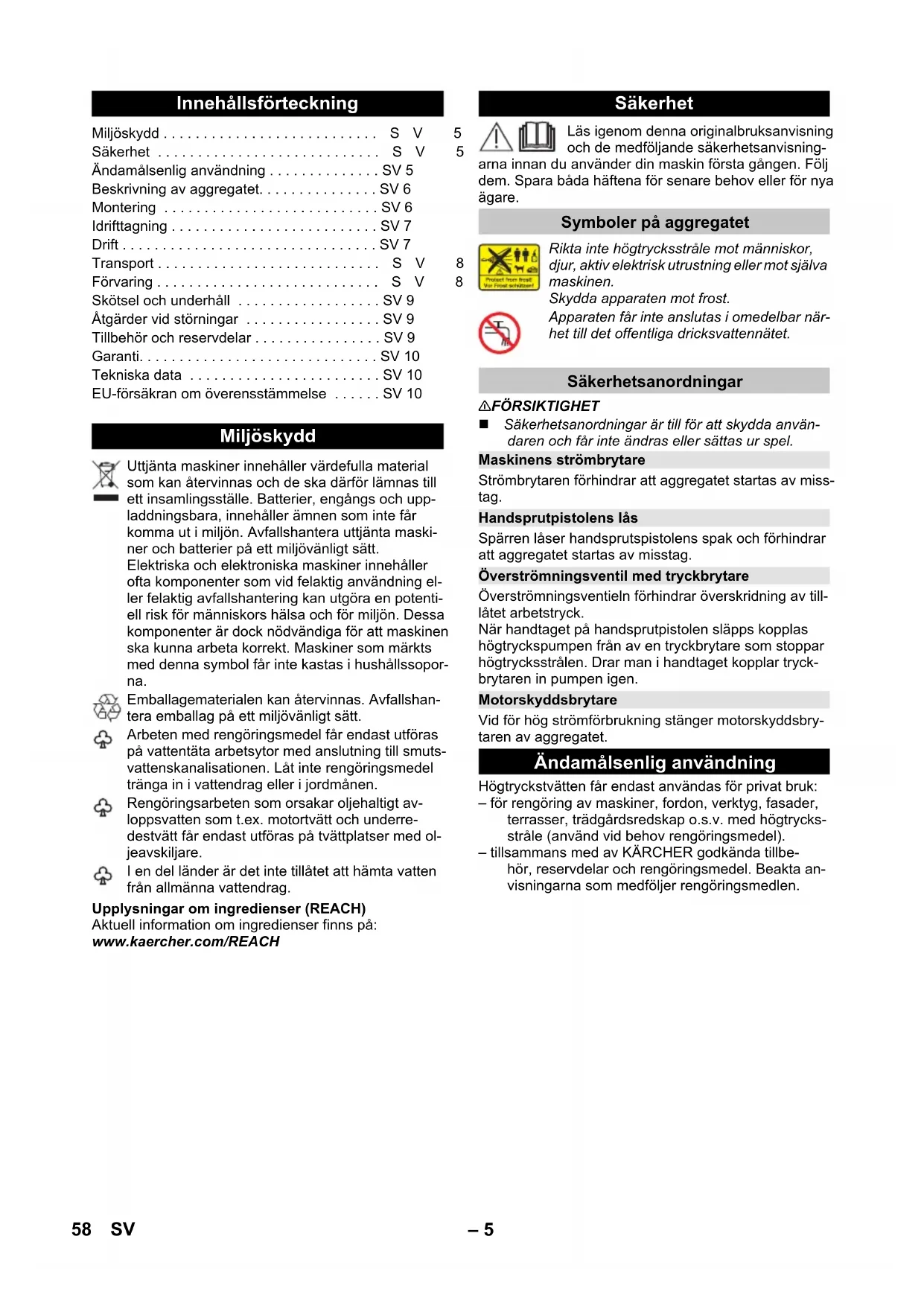 90 dB(A) Det tas forbehold om tekniske endringer. EU-samsvarserklæring Produkt: Høytrykksvasker Type: 1.324-xxx Relevante EU-direktiver 2006/42/EF (+2009/127/EF) 2014/30/EU 2011/65/EU 2000/14/EF Anvendte overensstemmende normer EN 50581 EN 55014–1: 2006+A1: 2009+A2: 2011 EN 55014–2: 2015 EN 60335–1 EN 60335–2–79 EN 61000–3–2: 2014 EN 61000–3–3: 2013 EN 62233: 2008 Anvendt metode for samsvarsvurdering 2000/14/EF: Vedlegg V Lydeffektnivå dB(A) Målt: 88 Garantert: 90 Winnenden, 2018/10/01 Chairman of the Board of Management Director Regulatory Affairs & Certification 57NO– 5 Upplysningar om ingredienser (REACH) Aktuell information om ingredienser finns på: www.kaercher.com/REACH Läs igenom denna originalbruksanvisning och de medföljande säkerhetsanvisning- arna innan du använder din maskin första gången. Följ dem. Spara båda häftena för senare behov eller för nya ägare. 몇 FÖRSIKTIGHET Säkerhetsanordningar är till för att skydda använ- daren och får inte ändras eller sättas ur spel. Strömbrytaren förhindrar att aggregatet startas av miss- tag. Spärren låser handsprutspistolens spak och förhindrar att aggregatet startas av misstag. Överströmningsventieln förhindrar överskridning av till- låtet arbetstryck. När handtaget på handsprutpistolen släpps kopplas högtryckspumpen från av en tryckbrytare som stoppar högtrycksstrålen. Drar man i handtaget kopplar tryck- brytaren in pumpen igen. Vid för hög strömförbrukning stänger motorskyddsbry- taren av aggregatet. Högtryckstvätten får endast användas för privat bruk: – för rengöring av maskiner, fordon, verktyg, fasader, terrasser, trädgårdsredskap o.s.v. med högtrycks- stråle (använd vid behov rengöringsmedel). – tillsammans med av KÄRCHER godkända tillbe- hör, reservdelar och rengöringsmedel. Beakta an- visningarna som medföljer rengöringsmedlen. Innehållsförteckning Miljöskydd . . . . . . . . . . . . . . . . . . . . . . . . . . .SV 5 Säkerhet . . . . . . . . . . . . . . . . . . . . . . . . . . . .SV 5 Ändamålsenlig användning . . . . . . . . . . . . . . SV 5 Beskrivning av aggregatet. . . . . . . . . . . . . . . SV 6 Montering . . . . . . . . . . . . . . . . . . . . . . . . . . . SV 6 Idrifttagning . . . . . . . . . . . . . . . . . . . . . . . . . . SV 7 Drift . . . . . . . . . . . . . . . . . . . . . . . . . . . . . . . . SV 7 Transport . . . . . . . . . . . . . . . . . . . . . . . . . . . .SV 8 Förvaring . . . . . . . . . . . . . . . . . . . . . . . . . . . .SV 8 Skötsel och underhåll . . . . . . . . . . . . . . . . . . SV 9 Åtgärder vid störningar . . . . . . . . . . . . . . . . . SV 9 Tillbehör och reservdelar . . . . . . . . . . . . . . . . SV 9 Garanti. . . . . . . . . . . . . . . . . . . . . . . . . . . . . . SV 10 Tekniska data . . . . . . . . . . . . . . . . . . . . . . . . SV 10 EU-försäkran om överensstämmelse . . . . . . SV 10 Miljöskydd Uttjänta maskiner innehåller värdefulla material som kan återvinnas och de ska därför lämnas till ett insamlingsställe. Batterier, engångs och upp- laddningsbara, innehåller ämnen som inte får komma ut i miljön. Avfallshantera uttjänta maski- ner och batterier på ett miljövänligt sätt. Elektriska och elektroniska maskiner innehåller ofta komponenter som vid felaktig användning el- ler felaktig avfallshantering kan utgöra en potenti- ell risk för människors hälsa och för miljön. Dessa komponenter är dock nödvändiga för att maskinen ska kunna arbeta korrekt. Maskiner som märkts med denna symbol får inte kastas i hushållssopor- na. Emballagematerialen kan återvinnas. Avfallshan- tera emballag på ett miljövänligt sätt. Arbeten med rengöringsmedel får endast utföras på vattentäta arbetsytor med anslutning till smuts- vattenskanalisationen. Låt inte rengöringsmedel tränga in i vattendrag eller i jordmånen. Rengöringsarbeten som orsakar oljehaltigt av- loppsvatten som t.ex. motortvätt och underre- destvätt får endast utföras på tvättplatser med ol- jeavskiljare. I en del länder är det inte tillåtet att hämta vatten från allmänna vattendrag. Säkerhet Symboler på aggregatet Rikta inte högtrycksstråle mot människor, djur, aktiv elektrisk utrustning eller mot själva maskinen. Skydda apparaten mot frost. Apparaten får inte anslutas i omedelbar när- het till det offentliga dricksvattennätet. Säkerhetsanordningar Maskinens strömbrytare Handsprutpistolens lås Överströmningsventil med tryckbrytare Motorskyddsbrytare Ändamålsenlig användning 58 SV– 6 Maskinens leveransomfattning (beroende på modell) anges på förpackningen. Den här bruksanvisningen be- skriver alla alternativ. Kontakta din försäljare om något tillbehör saknas eller om det finns transportskador. Figurer och bilder finns på kartongens utfällbara sida 3 1 Kopplingsdel för vattenanslutning 2 Vattenanslutning med inbyggt filter 3 Högtrycksslang 4 Slangdragning 5 Förvaring för stålrör 6 Förvaring/parkeringsposition för högtryckspistol 7 Anslutning för Plug 'n' Clean rengöringsmedel 8 Bärhandtag 9 Transporthandtag, utdragbart 10 Slanghållare 11 Högtrycksanslutning 12 Strömbrytare "0/OFF / I/ON" 13 Nätkabel med nätkontakt 14 Typskylt 15 Tillbehörsfack 16 Krok för nätinfästning 17 Nät för tillbehörsfack 18 Transporthjul 19 Fot med bärhandtag 20 Full Control handsprutpistol 21 Batterifack 22 LED tryckvisning MIX / 1 - SOFT / 2 - MEDIUM / 3 - HARD 23 Lås batterifack 24 Handsprutpistolens lås 25 Knapp för att ta loss högtrycksslangen från hand- sprutpistolen 26 Full Control strålrör Vario Power För de vanligaste rengöringsuppgifterna Trycksteg: HARD / MEDIUM / SOFT / MIX 27 Full Control strålrör smutsfräs Vid hårt fastsittande smuts Trycksteg: HARD Figurer och bilder finns på kartongens utfällbara sida 4 Montera de bifogade lösa delarna på aggregatet innan det tas i drift. För det krävs de medföljande skruvarna och en kryss-