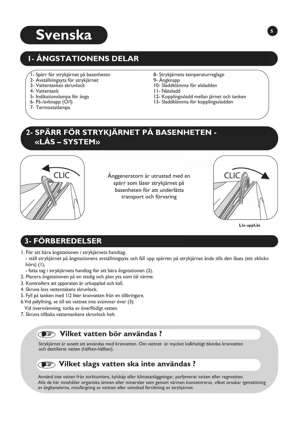 Ånggeneratorn är utrustad med en spärr som låser strykjärnet på basenheten för att underlätta transport och förvaring Lås uppLåsVåra tips :