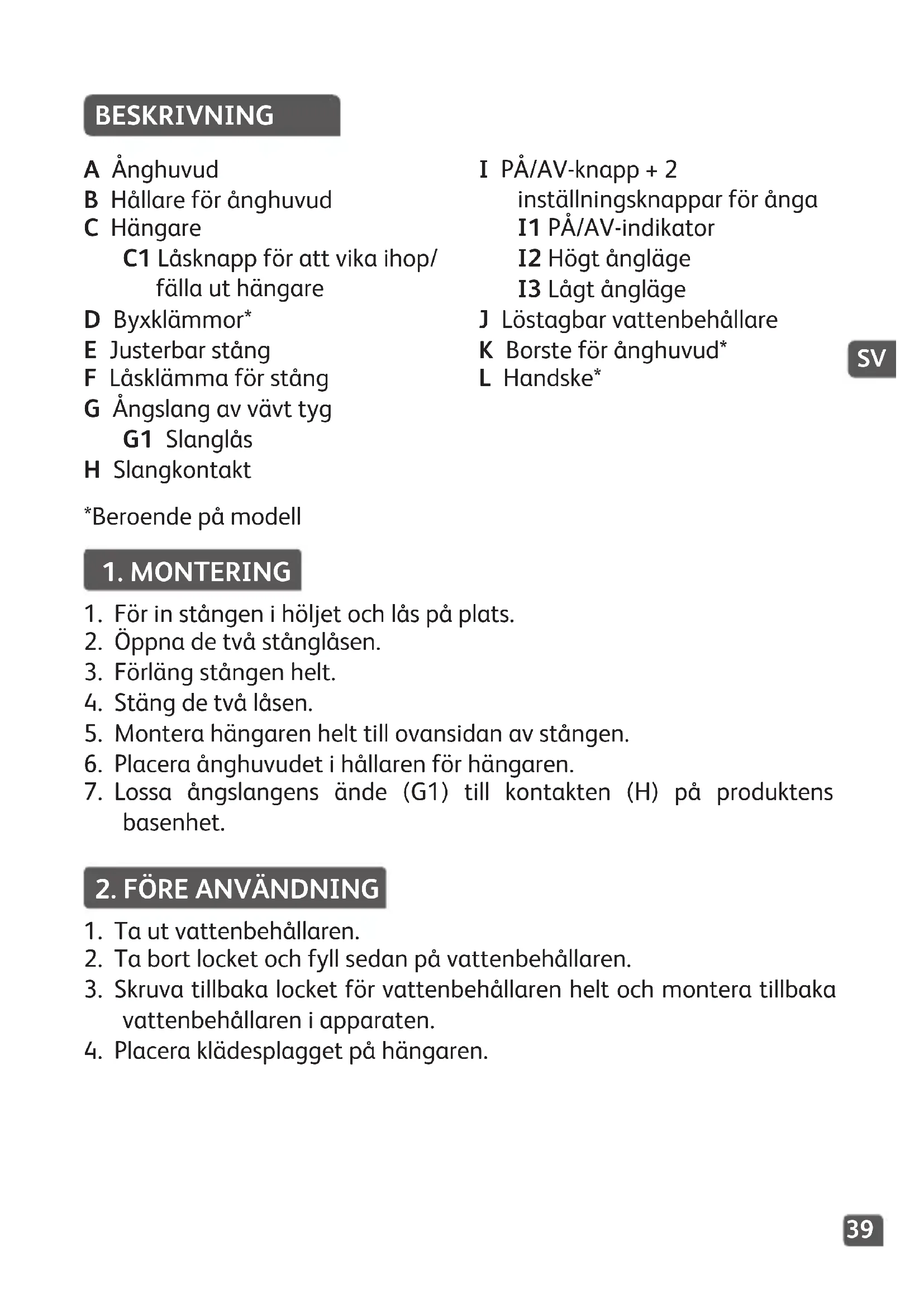 BESKRIVNING A Ånghuvud B Hållare för ånghuvud C Hängare C1 Låsknapp för att vika ihop/ fälla ut hängare D Byxklämmor* E Justerbar stång F Låsklämma för stång G Ångslang av vävt tyg G1 Slanglås H Slangkontakt I PÅ/AV-knapp + 2 inställningsknappar för ånga I1 PÅ/AV-indikator I2 Högt ångläge I3 Lågt ångläge J Löstagbar vattenbehållare K Borste för ånghuvud* L Handske*