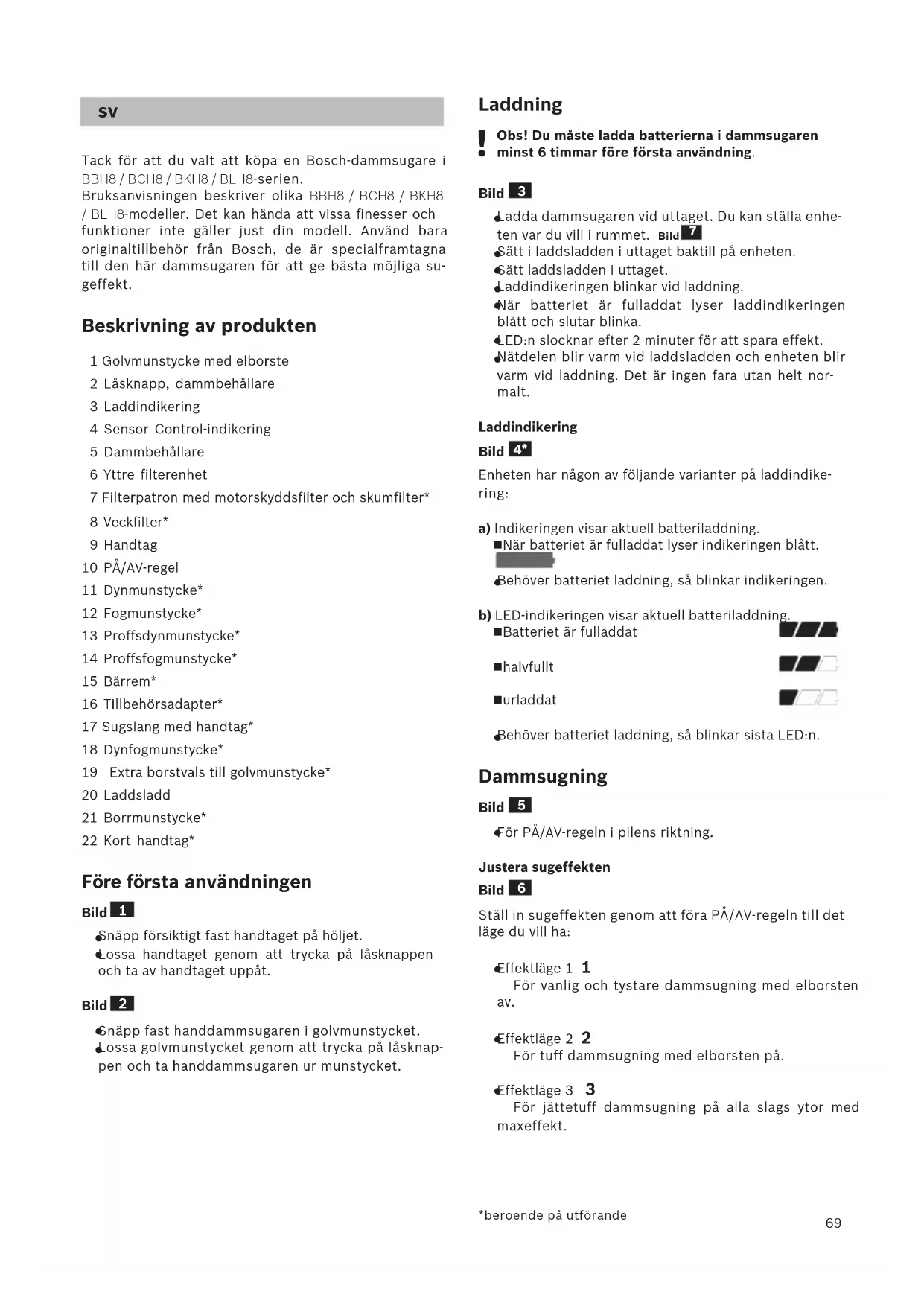 Tack för att du valt att köpa en Bosch-dammsugare i BBH8 / BCH8 / BKH8 / BLH8-serien. Bruksanvisningen beskriver olika BBH8 / BCH8 / BKH8 / BLH8-modeller. Det kan hända att vissa finesser och funktioner inte gäller just din modell. Använd bara originaltillbehör från Bosch, de är specialframtagna till den här dammsugaren för att ge bästa möjliga su- geffekt. Beskrivning av produkten 1 Golvmunstycke med elborste 2 Låsknapp, dammbehållare 3 Laddindikering 4 Sensor Control-indikering 5 Dammbehållare 6 Yttre filterenhet 7 Filterpatron med motorskyddsfilter och skumfilter* 8 Veckfilter* 9 Handtag 10 PÅ/AV-regel 11 Dynmunstycke* 12 Fogmunstycke* 13 Proffsdynmunstycke* 14 Proffsfogmunstycke* 15 Bärrem* 16 Tillbehörsadapter* 17 Sugslang med handtag* 18 Dynfogmunstycke* 19 Extra borstvals till golvmunstycke* 20 Laddsladd 21 Borrmunstycke* 22 Kort handtag* Före första användningen Bild