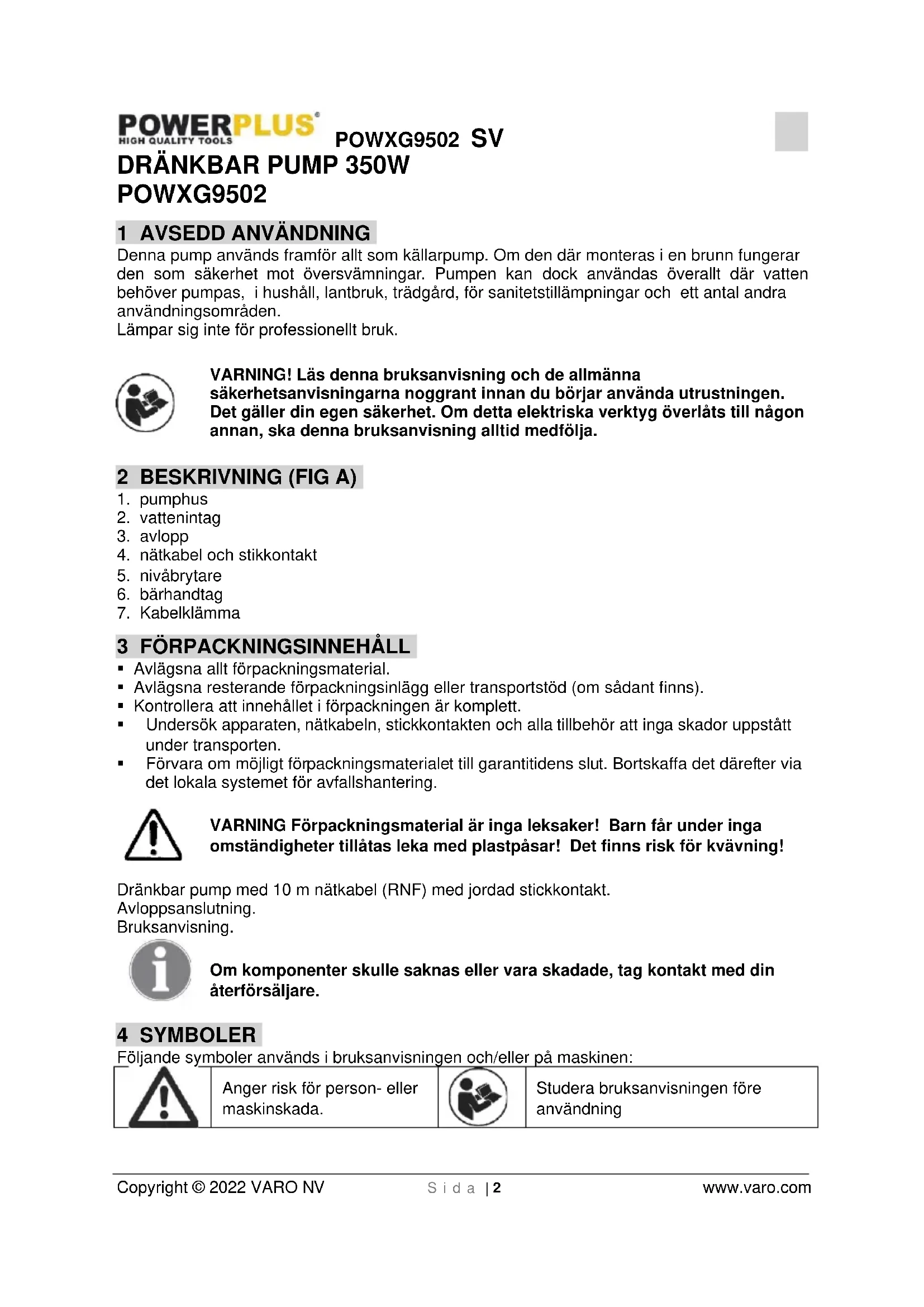 Studera bruksanvisningen före användningPOWXG9502 SV Copyright © 2022 VARO NV S i d a | 3 www.varo.com 5 ALLMÄNNA SÄKERHETSANVISNINGAR FÖR ELEKTRISKA VERKTYG Studera noga samtliga säkerhetsvarningar och alla anvisningar. Uraktlåtenhet att följa alla varningar och anvisningar kan medföra risk för elektriska stötar, brand och/eller allvarliga personskador. Spar alla varningar och instruktioner för framtida konsultation. Den nedan använda termen „elektriskt verktyg“ i varningarna avser nätdrivna elektriska verktyg (med nätkabel) eller batteridrivna (sladdlösa) elektriska verktyg. 6 OBSERVERA FÖLJANDE INNAN PUMPEN TAS I DRIFT!