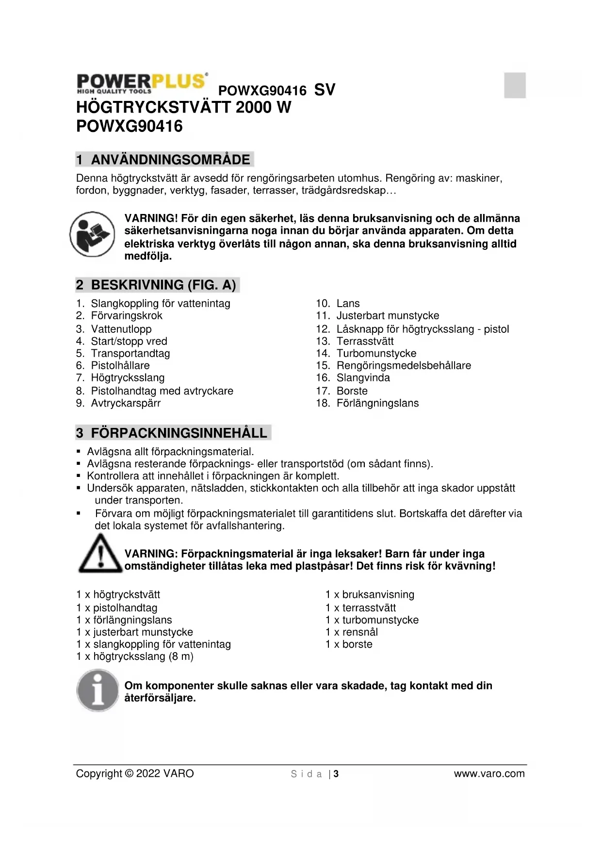 Om du efter en tid beslutar dig för att byta ut maskinen får den inte hanteras som hushållsavfall, den ska kasseras på ett miljövänligt sätt. Avfall som produceras av elektriska maskiner får inte hanteras på samma sätt som vanligt hushållsavfall. Ta avfallet till en återvinningscentral om det finns en sådan anläggning. Rådgör med lokala myndigheter eller försäljaren för rekommendationer om insamling och återvinning.POWXG90416 SV Copyright © 2022 VARO S i d a | 13 www.varo.com