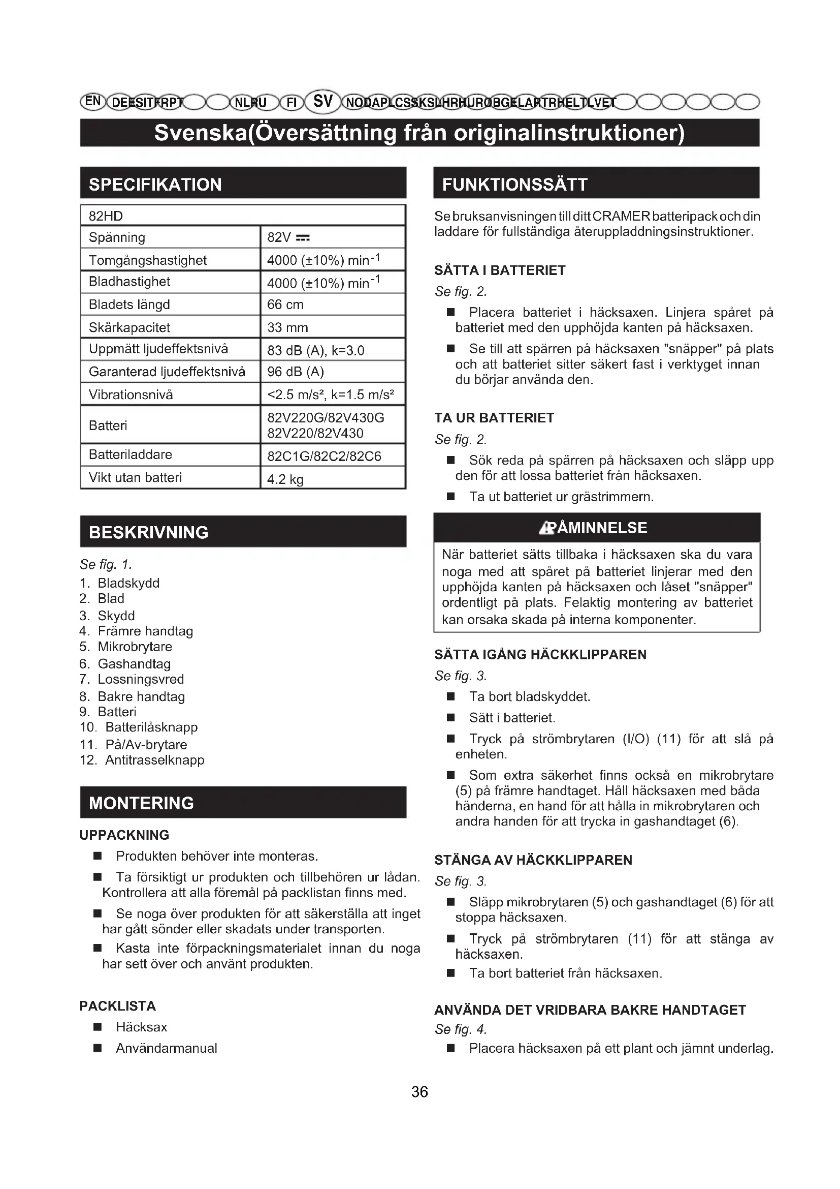 MONTERING UPPACKNING Produkten behöver inte monteras. Ta försiktigt ur produkten och tillbehören ur lådan. Kontrollera att alla föremål på packlistan finns med. Se noga över produkten för att säkerställa att inget har gått sönder eller skadats under transporten. Kasta inte förpackningsmaterialet innan du noga har sett över och använt produkten. PACKLISTA Häcksax Användarmanual FUNKTIONSSÄTT Se bruksanvisningen till ditt CRAMER batteripack och din laddare för fullständiga återuppladdningsinstruktioner.