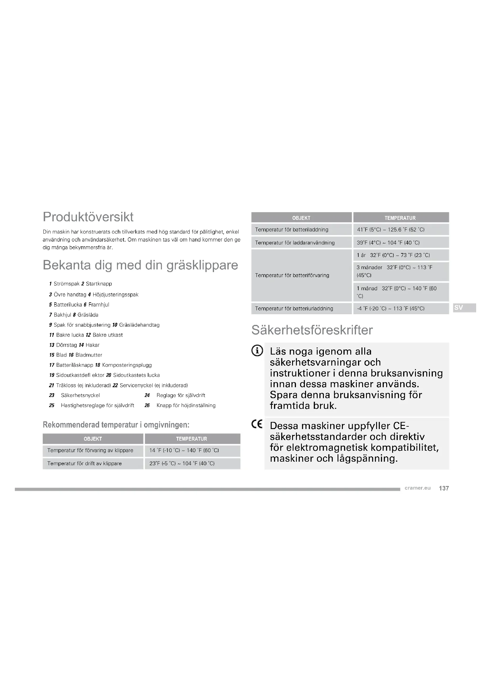 Produktöversikt Din maskin har konstruerats och tillverkats med hög standard för pålitlighet, enkel användning och användarsäkerhet. Om maskinen tas väl om hand kommer den ge dig många bekymmersfria år. Bekanta dig med din gräsklippare 1 Strömspak 2 Startknapp3 Övre handtag 4 Höjdjusteringsspak5 Batterilucka 6 Framhjul7 Bakhjul 8 Gräslåda9 Spak för snabbjustering 10 Gräslådehandtag11 Bakre lucka 12 Bakre utkast13 Dörrstag 14 Hakar15 Blad 16 Bladmutter17 Batterilåsknapp 18 Komposteringsplugg19 Sidoutkastdefl ektor 20 Sidoutkastets lucka21 Träkloss (ej inkluderad) 22 Servicenyckel (ej inkluderad) 23 Säkerhetsnyckel 24 Reglage för självdrift 25 Hastighetsreglage för självdrift 26 Knapp för höjdinställning Rekommenderad temperatur i omgivningen: OBJEKT TEMPERATUR Temperatur för förvaring av klippare 14 ˚F (-10 ˚C) ~ 140 ˚F (60 ˚C)Temperatur för drift av klippare 23˚F (-5 ˚C) ~ 104 ˚F (40 ˚C)OBJEKT TEMPERATUR Temperatur för batteriladdning 41˚F (5°C) ~ 125.6 ˚F (52 ˚C)Temperatur för laddaranvändning 39˚F (4°C) ~ 104 ˚F (40 ˚C) Temperatur för batteriförvaring 1 år 32˚F (0°C) ~ 73 ˚F (23 ˚C) 3 månader 32˚F (0°C) ~ 113 ˚F (45°C) 1 månad 32˚F (0°C) ~ 140 ˚F (60 ˚C) Temperatur för batteriurladdning -4 ˚F (-20 ˚C) ~ 113 ˚F (45°C) Säkerhetsföreskrifter Läs noga igenom alla säkerhetsvarningar och instruktioner i denna bruksanvisning innan dessa maskiner används. Spara denna bruksanvisning för framtida bruk. Dessa maskiner uppfyller CE- säkerhetsstandarder och direktiv för elektromagnetisk kompatibilitet, maskiner och lågspänning.138 cramer.eu