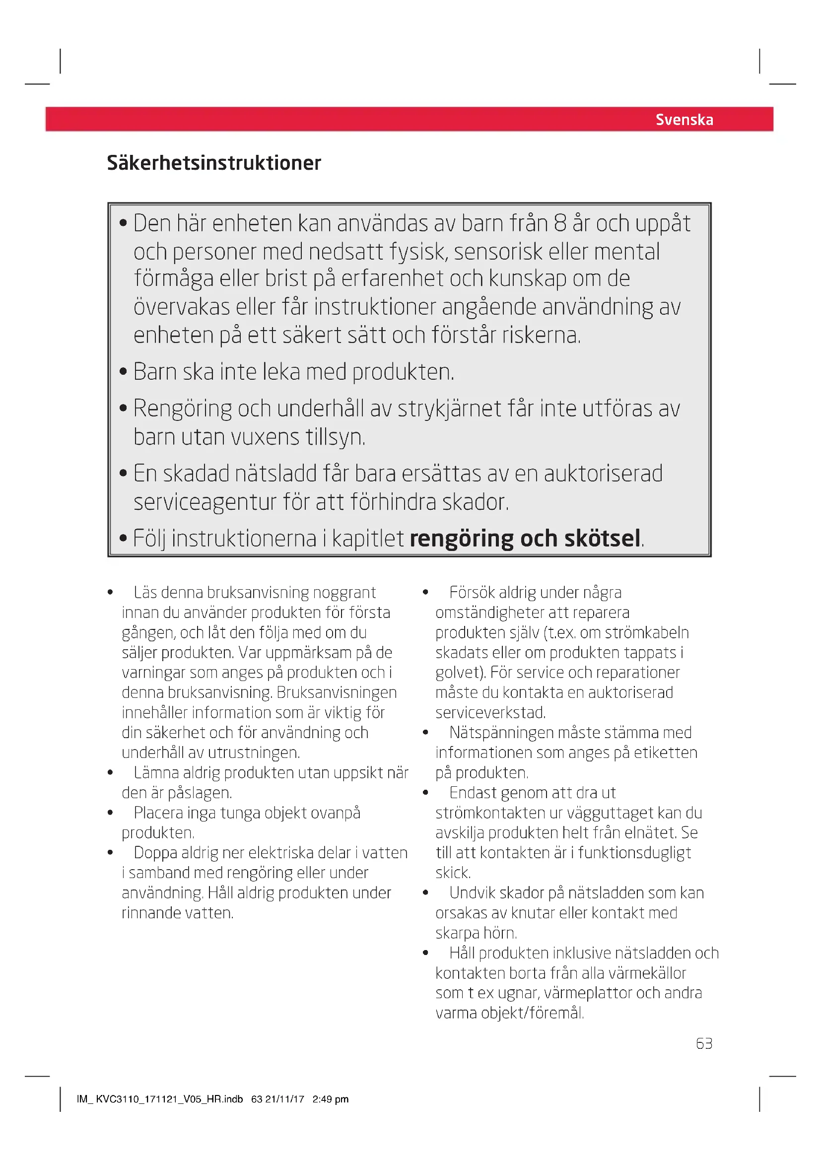 - Håll produkten inklusive nätsladden och kontakten borta från alla värmekällor som t ex ugnar, värmeplattor och andra varma objekt/föremål. IM_ KVC3110_171121_V05_HR.indb 63 21/11/17 2:49 pmSvenska
