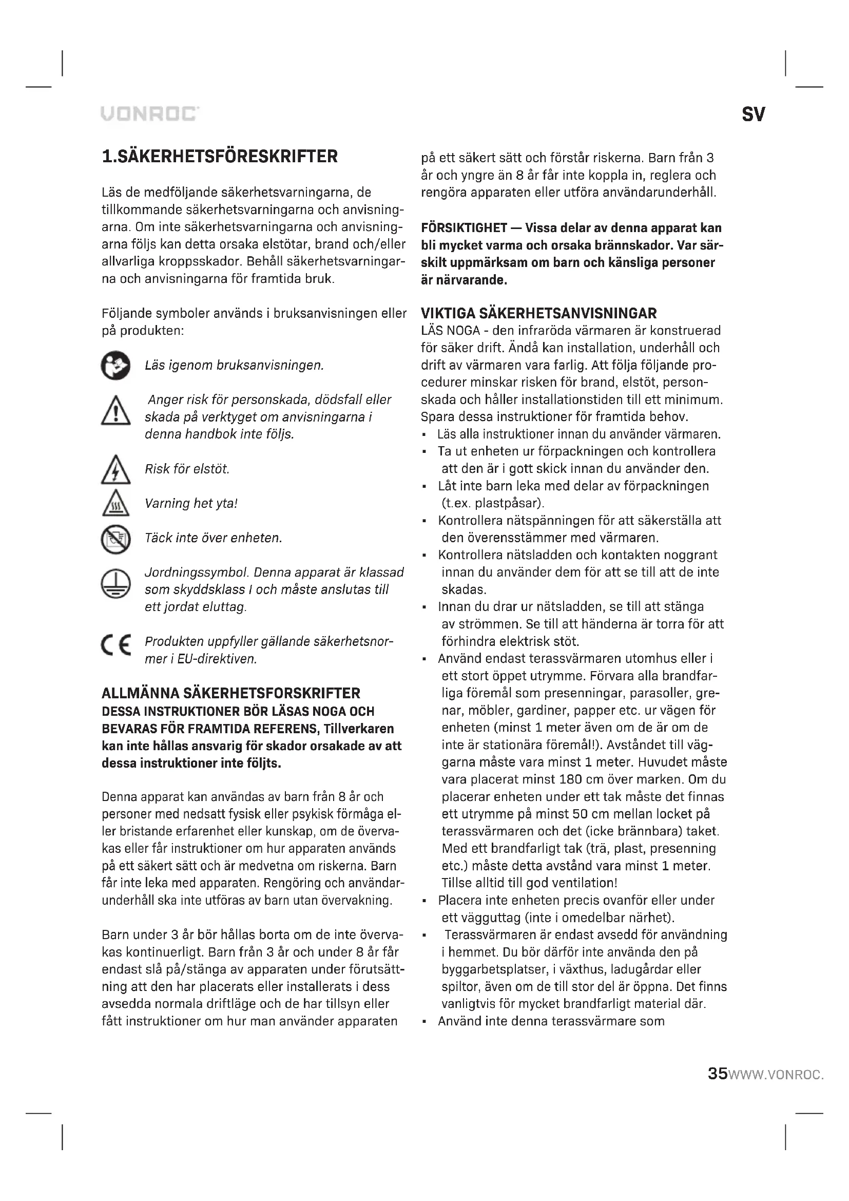LÄS NOGA - den infraröda värmaren är konstruerad för säker drift. Ändå kan installation, underhåll och drift av värmaren vara farlig. Att följa följande pro- cedurer minskar risken för brand, elstöt, person- skada och håller installationstiden till ett minimum. Spara dessa instruktioner för framtida behov.