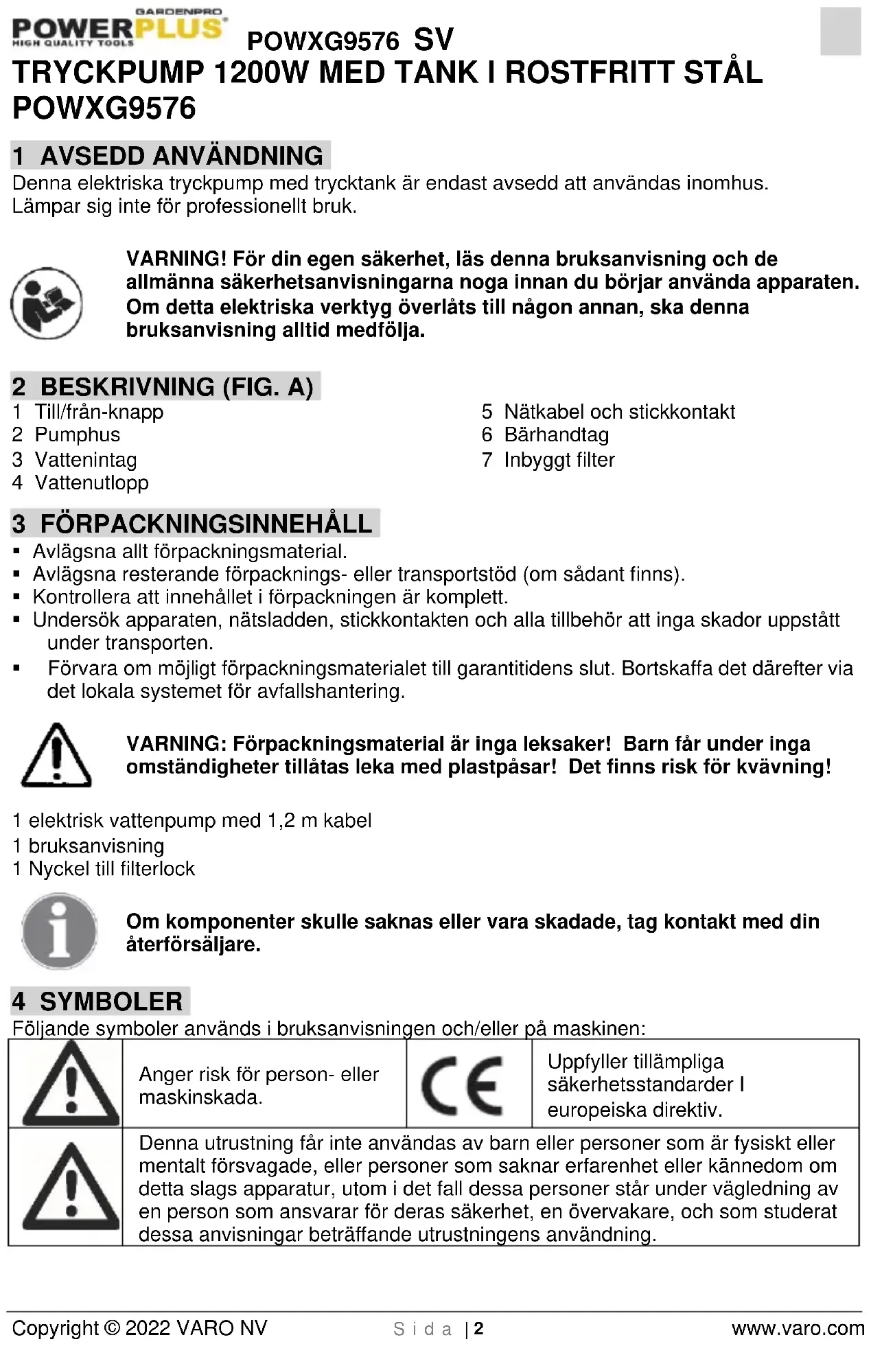- Dra alltid stickkontakten ur eluttaget före rengöring eller underhåll på pumpen.POWXG9576 SV Copyright © 2022 VARO NV S i d a | 5 www.varo.com