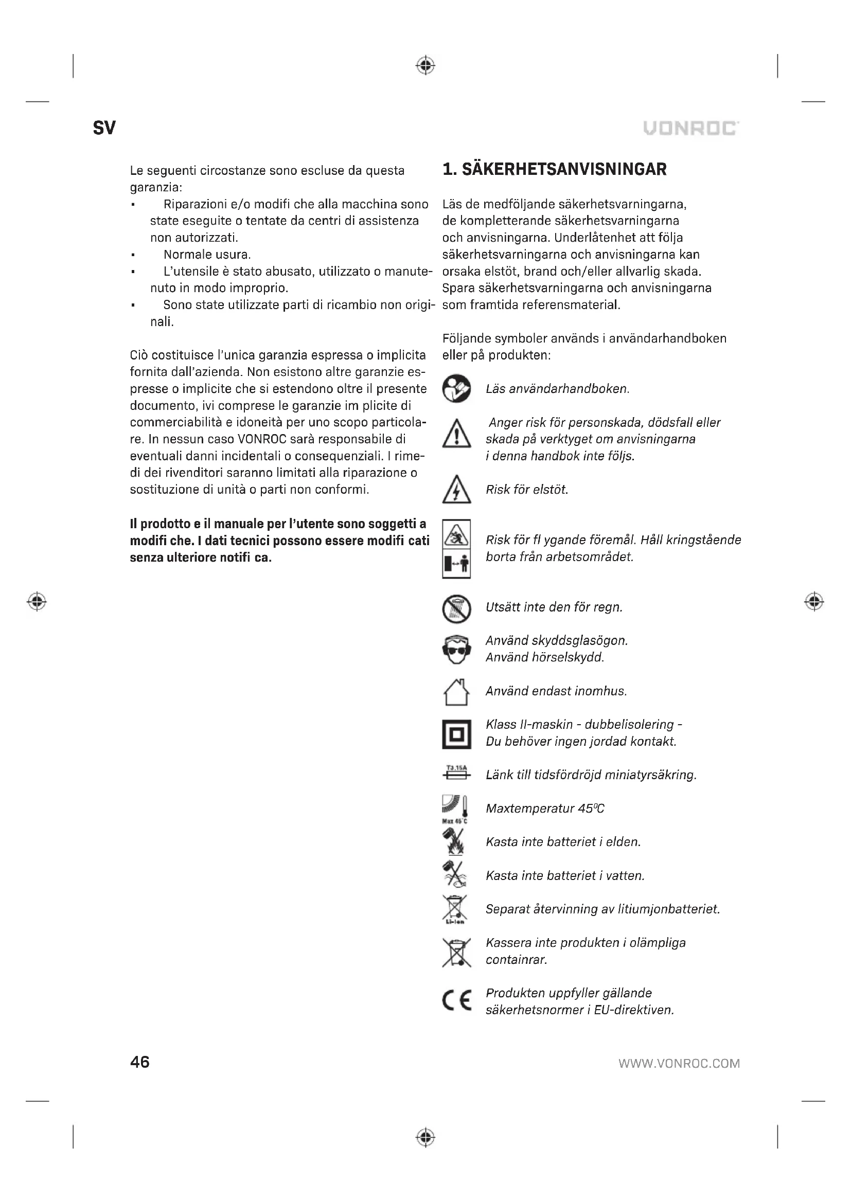- Reservdelar som inte är original har använts. Detta utgör den enda garantin som företaget ger antingen uttryckt eller underförstått. Det fi nns inga andra garantier uttryckta eller underförstådda som sträcker sig bortom detta, inklusive de underförstådda garantierna för säljbarhet och lämplighet för ett visst syfte. Under inga omständigheter ska VONROC hållas ansvarigt för indirekta skador eller följdskador. Återförsäljarnas åtgärder ska begränsas till reparation eller byte av enheter eller delar som inte uppfyller kraven. Produkten och användarhandboken kan ändras. Specifi kationerna kan ändras utan förvarning.DA