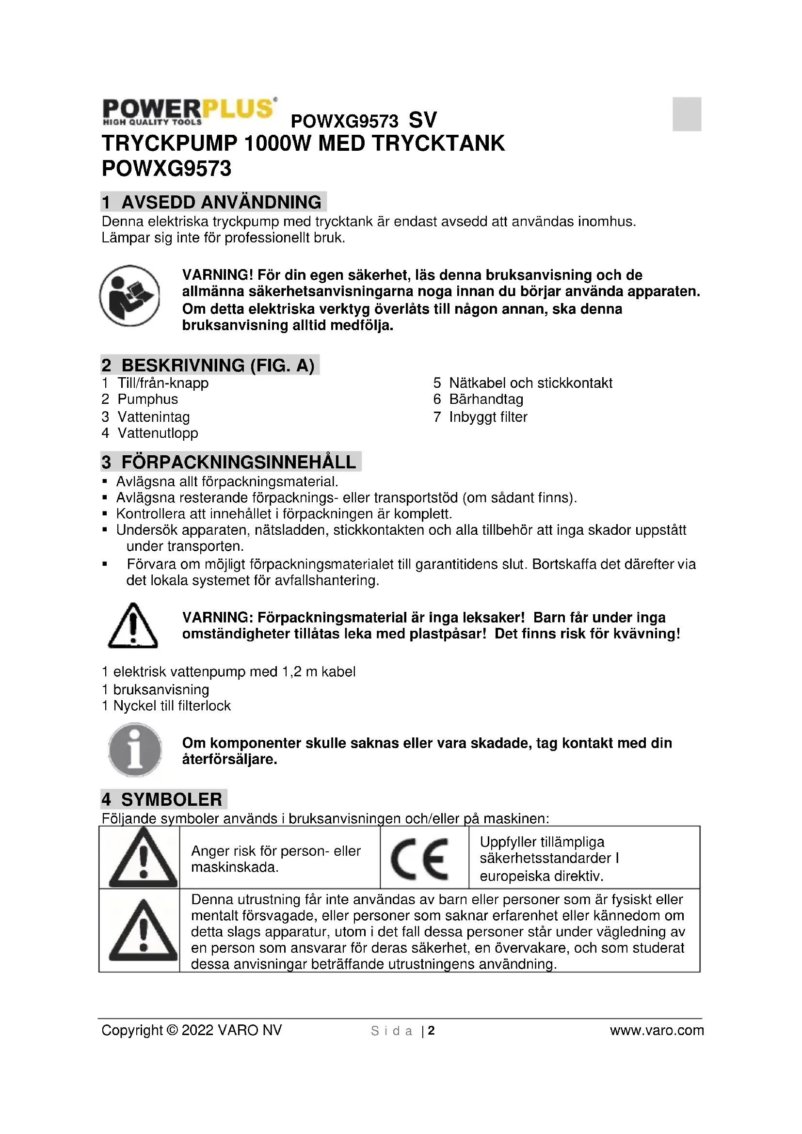 - Dra alltid stickkontakten ur eluttaget före rengöring eller underhåll på pumpen.POWXG9573 SV Copyright © 2022 VARO NV S i d a | 5 www.varo.com