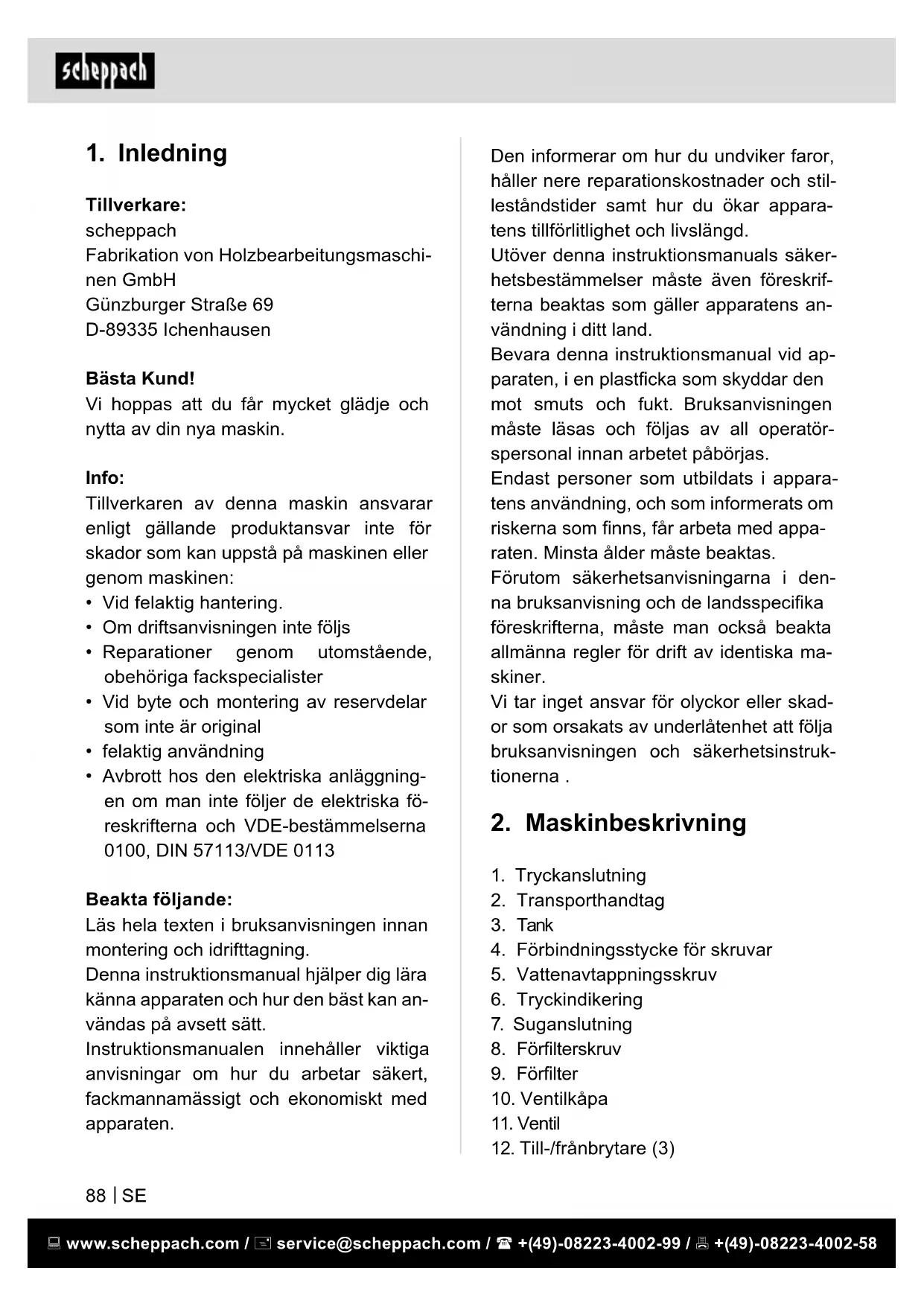 - Avbrott hos den elektriska anläggning- en om man inte följer de elektriska fö- reskrifterna och VDE-bestämmelserna 0100, DIN 57113/VDE 0113 Beakta följande: Läs hela texten i bruksanvisningen innan montering och idrifttagning. Denna instruktionsmanual hjälper dig lära känna apparaten och hur den bäst kan an- vändas på avsett sätt. Instruktionsmanualen innehåller viktiga anvisningar om hur du arbetar säkert, fackmannamässigt och ekonomiskt med apparaten. www.scheppach.com / service@scheppach.com / +(49)-08223-4002-99 / +(49)-08223-4002-58