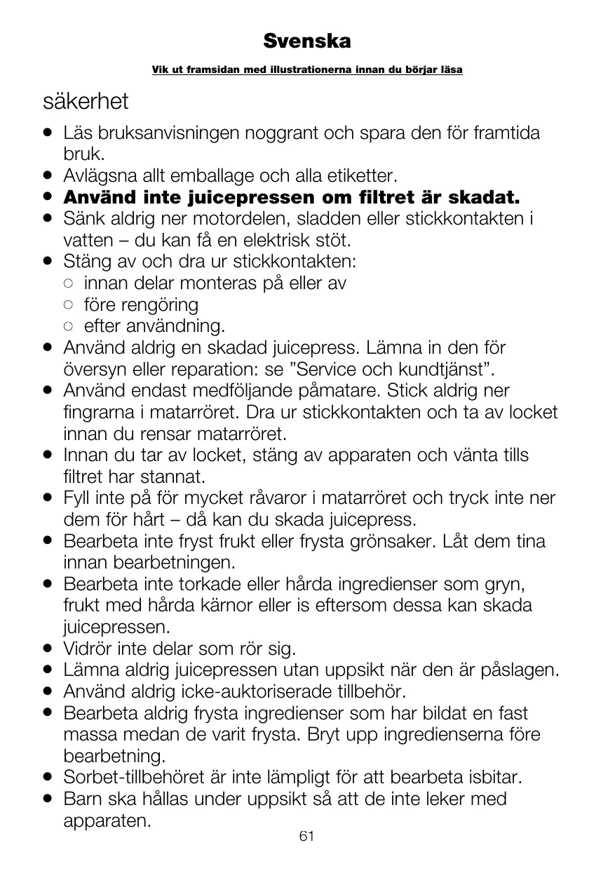 Läs bruksanvisningen noggrant och spara den för framtida bruk. Avlägsna allt emballage och alla etiketter. Använd inte juicepressen om filtret är skadat. Sänk aldrig ner motordelen, sladden eller stickkontakten i vatten – du kan få en elektrisk stöt. Stäng av och dra ur stickkontakten: innan delar monteras på eller av före rengöring efter användning. Använd aldrig en skadad juicepress. Lämna in den för översyn eller reparation: se ”Service och kundtjänst”. Använd endast medföljande påmatare. Stick aldrig ner fingrarna i matarröret. Dra ur stickkontakten och ta av locket innan du rensar matarröret. Innan du tar av locket, stäng av apparaten och vänta tills filtret har stannat. Fyll inte på för mycket råvaror i matarröret och tryck inte ner dem för hårt – då kan du skada juicepress. Bearbeta inte fryst frukt eller frysta grönsaker. Låt dem tina innan bearbetningen. Bearbeta inte torkade eller hårda ingredienser som gryn, frukt med hårda kärnor eller is eftersom dessa kan skada juicepressen. Vidrör inte delar som rör sig. Lämna aldrig juicepressen utan uppsikt när den är påslagen. Använd aldrig icke-auktoriserade tillbehör. Bearbeta aldrig frysta ingredienser som har bildat en fast massa medan de varit frysta. Bryt upp ingredienserna före bearbetning. Sorbet-tillbehöret är inte lämpligt för att bearbeta isbitar. Barn ska hållas under uppsikt så att de inte leker med apparaten. 61
