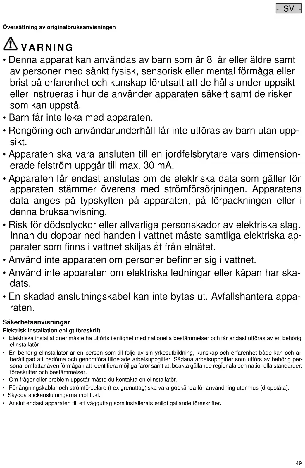 - Risk för dödsolyckor eller allvarliga personskador av elektriska slag. Innan du doppar ned handen i vattnet måste samtliga elektriska ap- parater som finns i vattnet skiljas åt från elnätet.