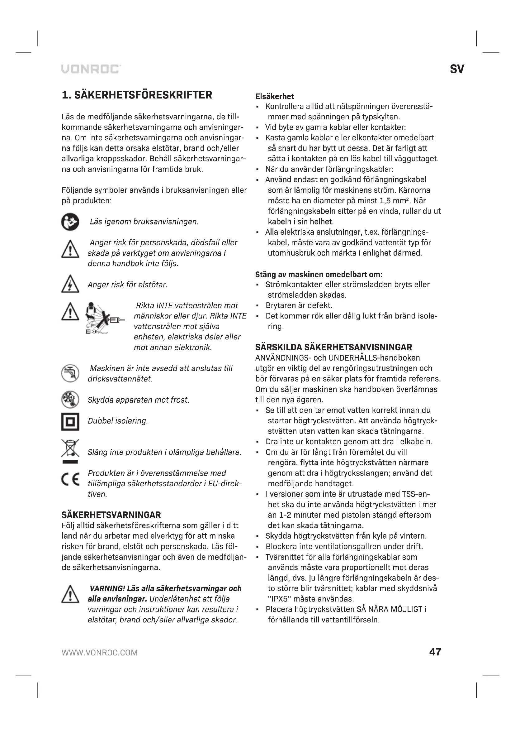 Läs de medföljande säkerhetsvarningarna, de till- kommande säkerhetsvarningarna och anvisningar- na. Om inte säkerhetsvarningarna och anvisningar- na följs kan detta orsaka elstötar, brand och/eller allvarliga kroppsskador. Behåll säkerhetsvarningar- na och anvisningarna för framtida bruk. Följande symboler används i bruksanvisningen eller på produkten: Läs igenom bruksanvisningen. Anger risk för personskada, dödsfall eller skada på verktyget om anvisningarna I denna handbok inte följs. Anger risk för elstötar. Rikta INTE vattenstrålen mot människor eller djur. Rikta INTE vattenstrålen mot själva enheten, elektriska delar eller mot annan elektronik. Maskinen är inte avsedd att anslutas till dricksvattennätet. Skydda apparaten mot frost. Dubbel isolering. Släng inte produkten i olämpliga behållare. Produkten är i överensstämmelse med tillämpliga säkerhetsstandarder i EU-direk- tiven. SÄKERHETSVARNINGAR Följ alltid säkerhetsföreskrifterna som gäller i ditt land när du arbetar med elverktyg för att minska risken för brand, elstöt och personskada. Läs föl- jande säkerhetsanvisningar och även de medföljan- de säkerhetsanvisningarna. VARNING! Läs alla säkerhetsvarningar och alla anvisningar. Underlåtenhet att följa varningar och instruktioner kan resultera i elstötar, brand och/eller allvarliga skador. Elsäkerhet