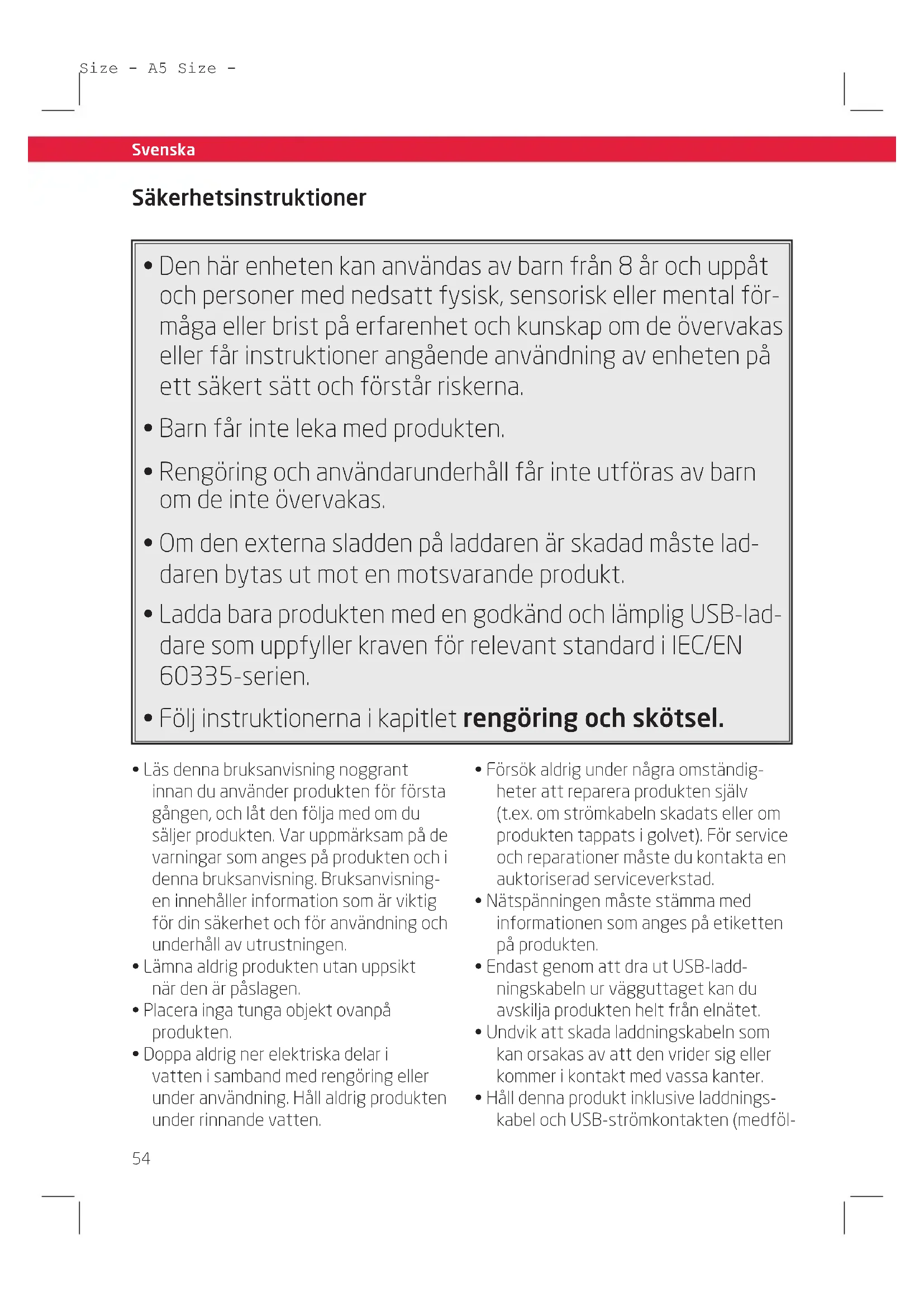 - Håll denna produkt inklusive laddnings- kabel och USB-strömkontakten (medföl-55 Svenska Size - A5