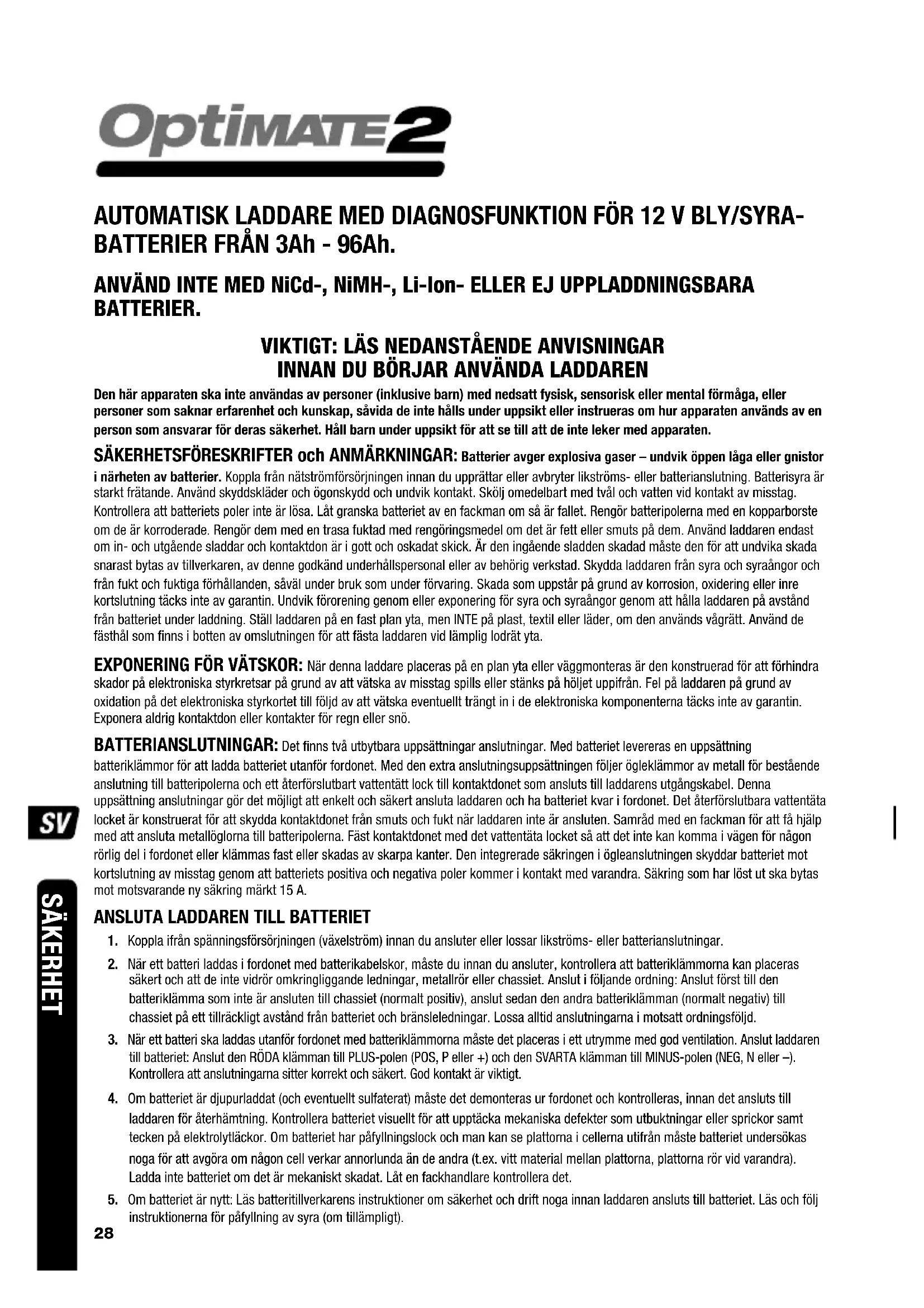 INNAN DU BÖRJAR ANVÄNDA LADDAREN Den här apparaten ska inte användas av personer (inklusive barn) med nedsatt fysisk, sensorisk eller mental förmåga, eller personer som saknar erfarenhet och kunskap, såvida de inte hålls under uppsikt eller instrueras om hur apparaten används av en person som ansvarar för deras säkerhet. Håll barn under uppsikt för att se till att de inte leker med apparaten. SÄKERHETSFÖRESKRIFTER och ANMÄRKNINGAR: Batterier avger explosiva gaser – undvik öppen låga eller gnistor i närheten av batterier. Koppla från nätströmförsörjningen innan du upprättar eller avbryter likströms- eller batterianslutning. Batterisyra är starkt frätande. Använd skyddskläder och ögonskydd och undvik kontakt. Skölj omedelbart med tvål och vatten vid kontakt av misstag. Kontrollera att batteriets poler inte är lösa. Låt granska batteriet av en fackman om så är fallet. Rengör batteripolerna med en kopparborste om de är korroderade. Rengör dem med en trasa fuktad med rengöringsmedel om det är fett eller smuts på dem. Använd laddaren endast om in- och utgående sladdar och kontaktdon är i gott och oskadat skick. Är den ingående sladden skadad måste den för att undvika skada snarast bytas av tillverkaren, av denne godkänd underhållspersonal eller av behörig verkstad. Skydda laddaren från syra och syraångor och från fukt och fuktiga förhållanden, såväl under bruk som under förvaring. Skada som uppstår på grund av korrosion, oxidering eller inre kortslutning täcks inte av garantin. Undvik förorening genom eller exponering för syra och syraångor genom att hålla laddaren på avstånd från batteriet under laddning. Ställ laddaren på en fast plan yta, men INTE på plast, textil eller läder, om den används vågrätt. Använd de fästhål som finns i botten av omslutningen för att fästa laddaren vid lämplig lodrät yta. EXPONERING FÖR VÄTSKOR: När denna laddare placeras på en plan yta eller väggmonteras är den konstruerad för att förhindra skador på elektroniska styrkretsar på grund av att vätska av misstag spills eller stänks på höljet uppifrån. Fel på laddaren på grund av oxidation på det elektroniska styrkortet till följd av att vätska eventuellt trängt in i de elektroniska komponenterna täcks inte av garantin. Exponera aldrig kontaktdon eller kontakter för regn eller snö. BATTERIANSLUTNINGAR: Det finns två utbytbara uppsättningar anslutningar. Med batteriet levereras en uppsättning batteriklämmor för att ladda batteriet utanför fordonet. Med den extra anslutningsuppsättningen följer ögleklämmor av metall för bestående anslutning till batteripolerna och ett återförslutbart vattentätt lock till kontaktdonet som ansluts till laddarens utgångskabel. Denna uppsättning anslutningar gör det möjligt att enkelt och säkert ansluta laddaren och ha batteriet kvar i fordonet. Det återförslutbara vattentäta locket är konstruerat för att skydda kontaktdonet från smuts och fukt när laddaren inte är ansluten. Samråd med en fackman för att få hjälp med att ansluta metallöglorna till batteripolerna. Fäst kontaktdonet med det vattentäta locket så att det inte kan komma i vägen för någon rörlig del i fordonet eller klämmas fast eller skadas av skarpa kanter. Den integrerade säkringen i ögleanslutningen skyddar batteriet mot kortslutning av misstag genom att batteriets positiva och negativa poler kommer i kontakt med varandra. Säkring som har löst ut ska bytas mot motsvarande ny säkring märkt 15 A.