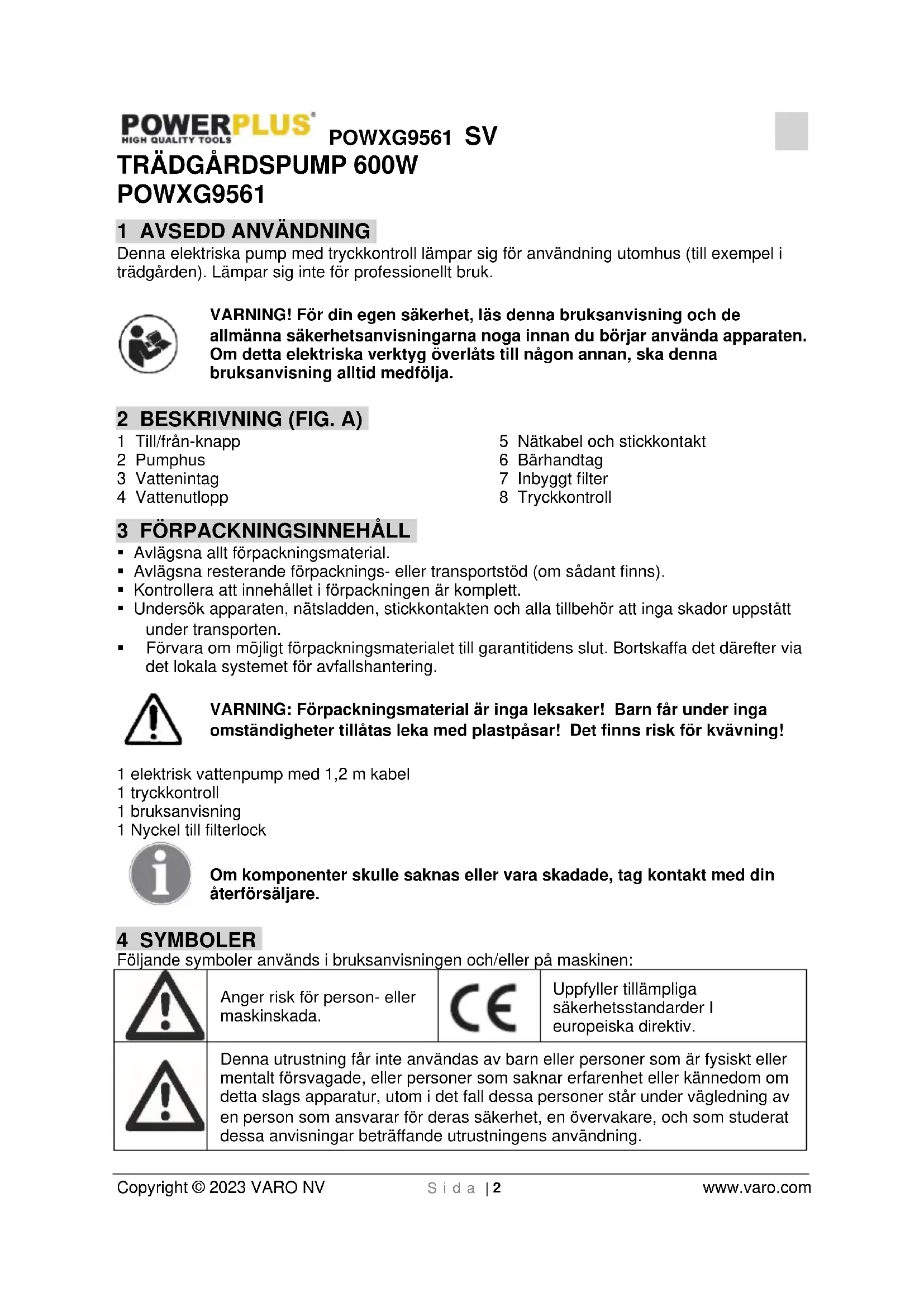 Denna utrustning får inte användas av barn eller personer som är fysiskt eller mentalt försvagade, eller personer som saknar erfarenhet eller kännedom om detta slags apparatur, utom i det fall dessa personer står under vägledning av en person som ansvarar för deras säkerhet, en övervakare, och som studerat dessa anvisningar beträffande utrustningens användning.POWXG9561 SV Copyright © 2023 VARO NV S i d a | 3 www.varo.com