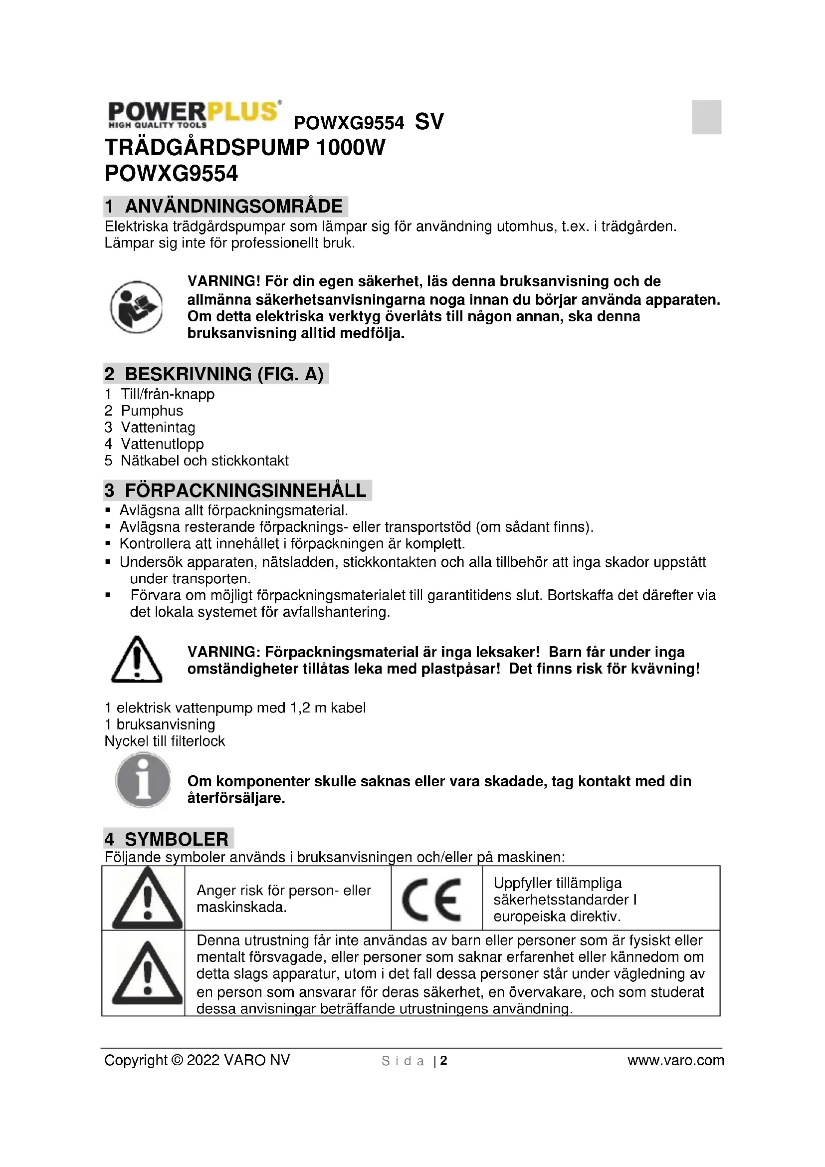 Då produkten tjänat ut får den inte lämnas med det vanliga hushållsavfallet utan ska deponeras på miljömässigt korrekt sätt och enligt gällande lokala bestämmelser. Avfall som kommer från elektriska maskinkomponenter får inte hanteras som vanligt hushållsavfall. De ska deponeras för återvinning där återvinningscentraler finns att tillgå. Kontakta lokala myndigheter eller din återförsäljare för närmare information om återvinning.POWXG9554 SV Copyright © 2022 VARO NV S i d a | 8 www.varo.com 14 KONFORMITETSDEKLARATION VARO N.V. –- Vic. Van Rompuy N.V. - Joseph Van Instraat 9 – BE2500 Lier – Belgien, deklarerar härmed att, Produkt: TRÄDGÅRDSPUMP 1000W Varumärke: POWERplus Modell: POWXG9554 överensstämmer med väsentliga krav och andra relevanta bestämmelser i tillämpliga Europeiska direktiv, baserat på tillämpningen av Europeiska harmoniserade standarder. Varje ej godkänd ändring av apparaten gör denna deklaration ogiltig. Europeiska direktiv (inklusive, i tillämpliga fall, ändringar till dessa, fram till dagen för undertecknandet): 2011/65/EU 2014/35/EU 2014/30/EU 2000/14/EC Annex V LwA measured 86dB(A) / guaranteed 88dB(A) Europeiska harmoniserade standarder (inklusive, i tillämpliga fall, ändringar till dessa, fram till dagen för undertecknandet): EN60335-1 : 2012 EN60335-2-41 : 2003 EN55014-1 : 2017 EN55014-2 : 2015