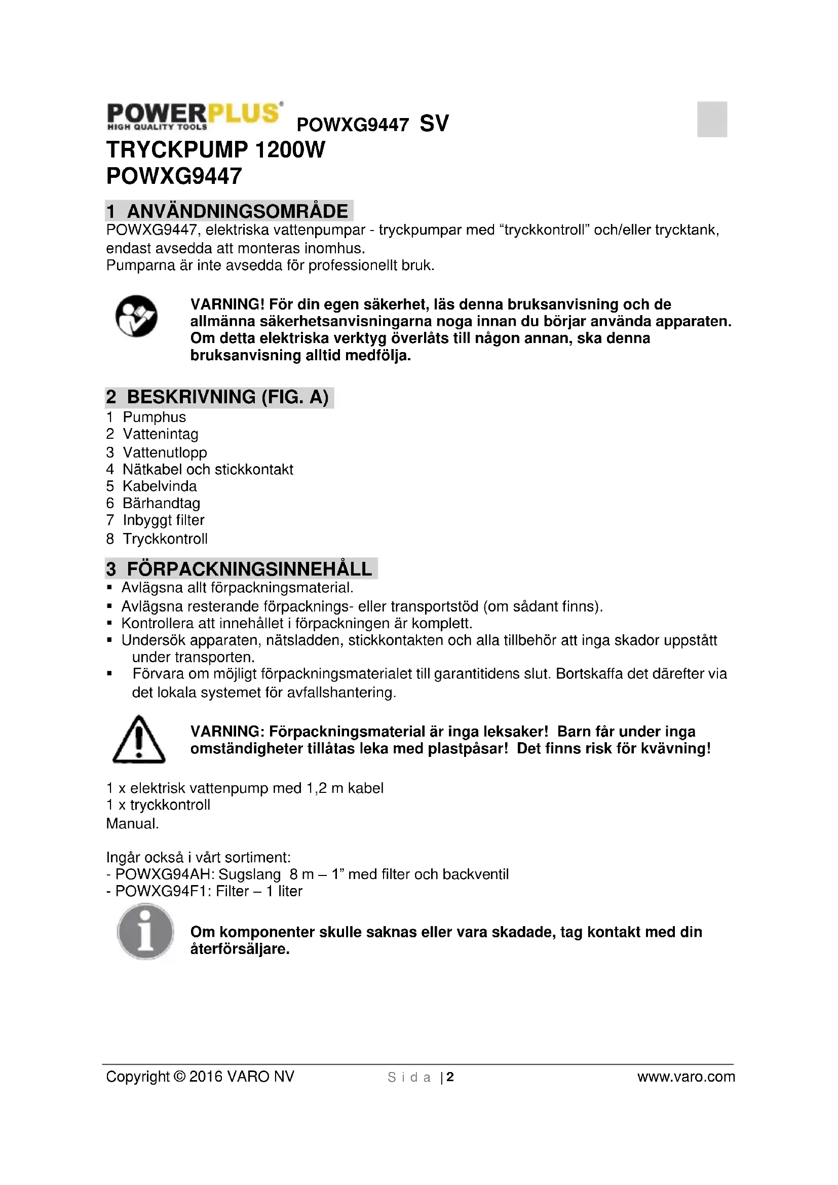 Då produkten tjänat ut får den inte lämnas med det vanliga hushållsavfallet utan ska deponeras på miljömässigt korrekt sätt och enligt gällande lokala bestämmelser. Avfall som kommer från elektriska maskinkomponenter får inte hanteras som vanligt hushållsavfall. De ska deponeras för återvinning där återvinningscentraler finns att tillgå. Kontakta lokala myndigheter eller din återförsäljare för närmare information om återvinning.POWXG9447 SV Copyright © 2016 VARO NV S i d a | 8 www.varo.com 15 KONFORMITETSDEKLARATION VARO N.V. – Joseph Van Instraat 9 – BE2500 Lier – Belgien, deklarerar härmed att, Utrustningens beteckning: Tryckpump Fabrikat: POWERplus Modell: POWXG9447 överensstämmer med väsentliga krav och andra relevanta bestämmelser i tillämpliga Europeiska direktiv, baserat på tillämpningen av Europeiska harmoniserade standarder. Varje ej godkänd ändring av apparaten gör denna deklaration ogiltig. Europeiska direktiv (inklusive, i tillämpliga fall, ändringar till dessa, fram till dagen för undertecknandet); 2011/65/EU 2006/95/EG 2004/108/EG 2000/14/EG Annex V LwA 81dB(A) / 84dB(A) Europeiska harmoniserade standarder (inklusive, i tillämpliga fall, ändringar till dessa, fram till dagen för undertecknandet); EN60335-1 : 2012 EN60335-2-41 : 2003 EN55014-1 : 2006 EN55014-2 : 1997 EN61000-3-2 : 2006 EN61000-3-3 : 2013 Ansvarig för den tekniska dokumentationen: Philippe Vankerkhove, VARO - Vic. Van Rompuy N.V. Undertecknad agerar på uppdrag av företagets VD, Hugo Cuypers Tillämpningsansvarig - Registrerings- och regelfrågor 26/06/2015POWXG9447 FI Copyright © 2016 VARO NV S i v u | 1 www.varo.com 1 KÄYTTÖ ........................................................................................... 2