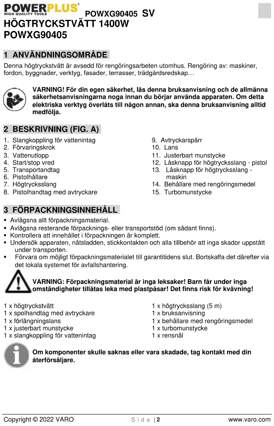 - Förvara om möjligt förpackningsmaterialet till garantitidens slut. Bortskaffa det därefter via det lokala systemet för avfallshantering. VARNING: Förpackningsmaterial är inga leksaker! Barn får under inga omständigheter tillåtas leka med plastpåsar! Det finns risk för kvävning! 1 x högtryckstvätt 1 x spolhandtag med avtryckare 1 x förlängningslans 1 x justerbart munstycke 1 x slangkoppling för vattenintag 1 x högtrycksslang (5 m) 1 x bruksanvisning 1 x behållare med rengöringsmedel 1 x turbomunstycke 1 x rensnål Om komponenter skulle saknas eller vara skadade, tag kontakt med din återförsäljare.POWXG90405 SV Copyright © 2022 VARO S i d a | 3 www.varo.com 4 EXTRA SÄKERHETSANVISNINGAR FÖR HÖGTRYCKSTVÄTTAR