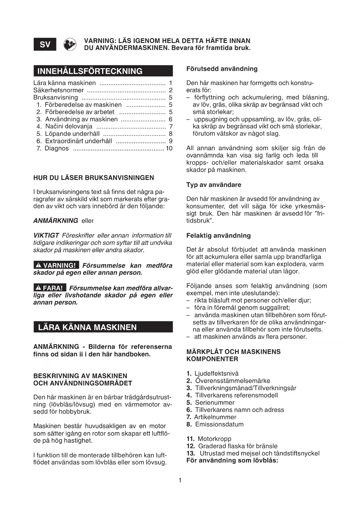 Den här maskinen är en bärbar trädgårdsutrust- ning (lövblås/lövsug) med en värmemotor av- sedd för hobbybruk. Maskinen består huvudsakligen av en motor som sätter igång en rotor som skapar ett luftö- de på hög hastighet. I funktion till de monterade tillbehören kan luft- ödet användas som lövblås eller som lövsug. Förutsedd användning Den här maskinen har formgetts och konstru- erats för: – föryttning och ackumulering, med blåsning, av löv, gräs, olika skräp av begränsad vikt och små storlekar; – uppsugning och uppsamling, av löv, gräs, oli- ka skräp av begränsad vikt och små storlekar, förutom vätskor av något slag. All annan användning som skiljer sig från de ovannämnda kan visa sig farlig och leda till kropps- och/eller materialskador samt orsaka skador på maskinen. Typ av användare Den här maskinen är avsedd för användning av konsumenter, det vill säga för icke yrkesmäs- sigt bruk. Den här maskinen är avsedd för ”fri- tidsbruk”. Felaktig användning Det är absolut förbjudet att använda maskinen för att ackumulera eller samla upp brandfarliga material eller material som kan explodera, varm glöd eller glödande material utan lågor. Följande anses som felaktig användning (som exempel, men inte uteslutande): – rikta blåsluft mot personer och/eller djur; – föra in föremål genom suggallret; – använda maskinen utan tillbehören som förut- setts av tillverkaren för de olika användningar- na eller använda tillbehör som inte förutsetts. – att maskinen används av era personer.