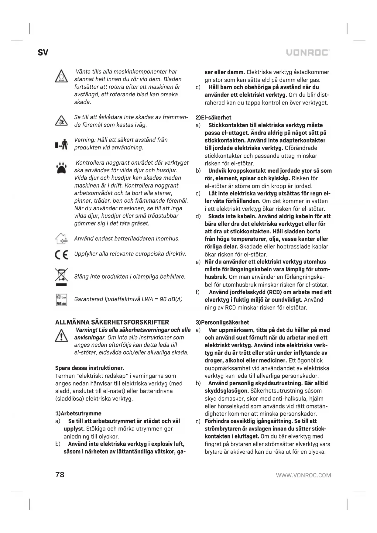 eller faller och skadas. MILJÖ Felaktig och/eller kasserad elektrisk eller elektronisk utrustning måste lämnas in på lämpliga återvinningsstationer. Endast för EU-länder Kassera inte elverktyg ihushållsavfall. Enligt den europeiska riktlinjen 2012/19/EU om kasserad elektrisk och elektronisk utrustning och dess tillämpning inationell rätt måste elverktyg som inte längre är användbara samlas in separat och kasseras på ett miljövänligt sätt. GARANTI VONROC produkter är utvecklade enligt högsta kva- litetsstandard och garanteras vara utan defekter både vad gäller material och tillverkning under den period som stipuleras enligt lag med början från ursprungligt inköpsdatum. Om något fel uppstår på produkten under denna period på grund av material- och/eller tillverkningsfel skall VONROC kontaktas direkt. Följande omständigheter exkluderas från denna garanti: