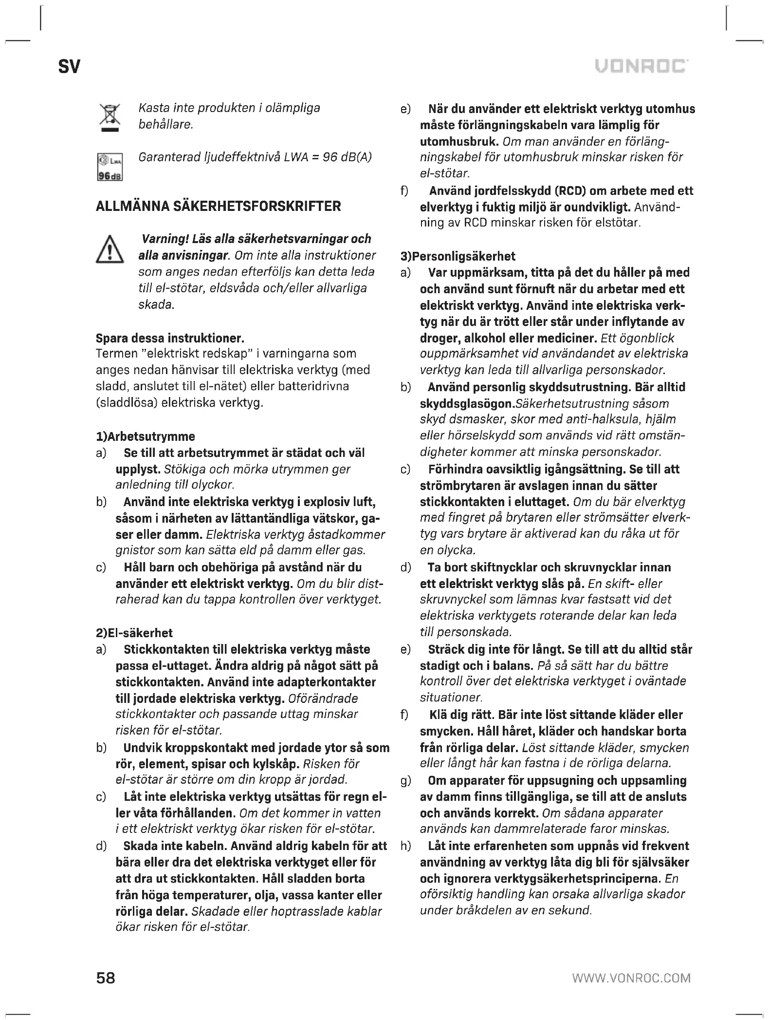 - Icke-originalreservdelar har använts. Detta utgör hela garantin från företaget, antingen uttryckt eller underförstått. Det finns inga andra garantier, uttalade eller underförstådda som gäller utöver ordalydelsen härav, häri, inklusive de outtalade garantierna för säljbarhet och lämplighet för ett särskilt syfte. Under inga omständigheter skall VONROC hållas ansvarig för några oförutsedda eller indirekta skador. Återförsäljarens åtgärder skall begränsas till reparation eller byte av felaktiga enheter eller delar. Med förbehåll för ändringar i produkten och bruksanvisningen. Specifikationer kan ändras utan förvarning.DA