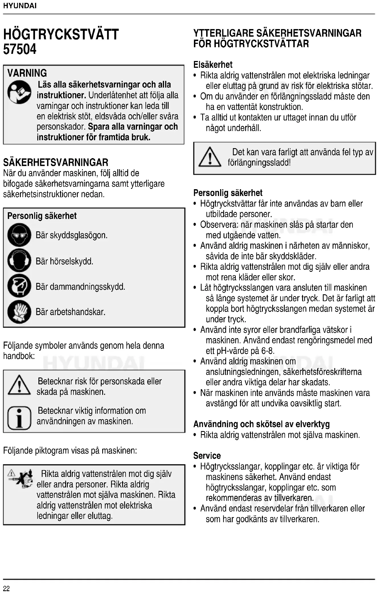 VARNING Läs alla säkerhetsvarningar och alla instruktioner. Underlåtenhet att följa alla varningar och instruktioner kan leda till en elektrisk stöt, eldsvåda och/eller svåra personskador. Spara alla varningar och instruktioner för framtida bruk. SÄKERHETSVARNINGAR När du använder maskinen, följ alltid de bifogade säkerhetsvarningarna samt ytterligare säkerhetsinstruktioner nedan. Personlig säkerhet Bär skyddsglasögon. Bär hörselskydd. Bär dammandningsskydd. Bär arbetshandskar. Följande symboler används genom hela denna handbok: Betecknar risk för personskada eller skada på maskinen. Betecknar viktig information om användningen av maskinen. Följande piktogram visas på maskinen: Rikta aldrig vattenstrålen mot dig själv eller andra personer. Rikta aldrig vattenstrålen mot själva maskinen. Rikta aldrig vattenstrålen mot elektriska ledningar eller eluttag.