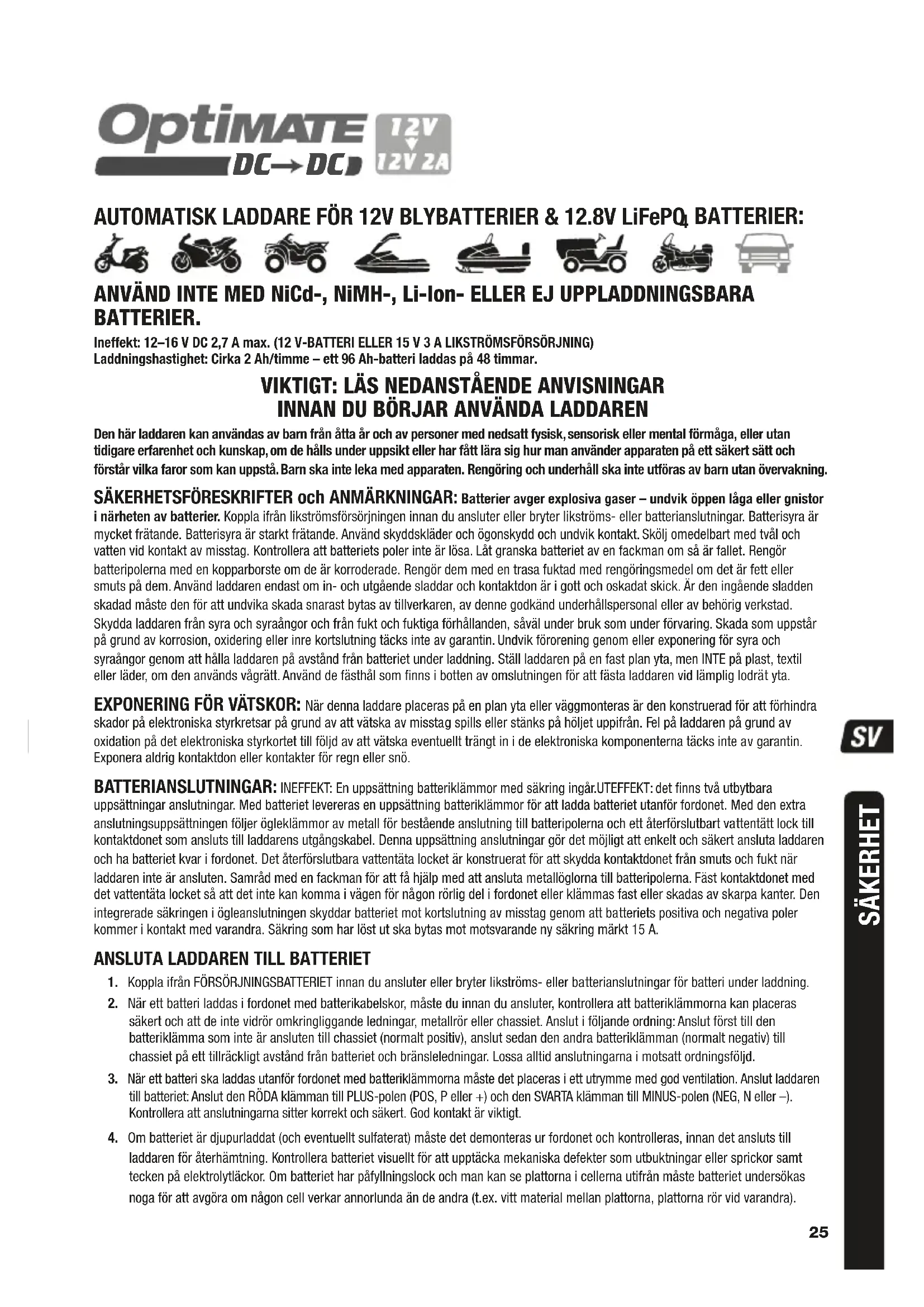 BATTERIER: ANVÄND INTE MED NiCd-, NiMH-, Li-Ion- ELLER EJ UPPLADDNINGSBARA BATTERIER. Ineffekt: 12–16 V DC 2,7 A max. (12 V-BATTERI ELLER 15 V 3 A LIKSTRÖMSFÖRSÖRJNING)Laddningshastighet: Cirka 2 Ah/timme – ett 96 Ah-batteri laddas på 48 timmar.VIKTIGT: LÄS NEDANSTÅENDE ANVISNINGAR INNAN DU BÖRJAR ANVÄNDA LADDAREN Den här laddaren kan användas av barn från åtta år och av personer med nedsatt fysisk, sensorisk eller mental förmåga, eller utan tidigare erfarenhet och kunskap, om de hålls under uppsikt eller har fått lära sig hur man använder apparaten på ett säkert sätt och förstår vilka faror som kan uppstå. Barn ska inte leka med apparaten. Rengöring och underhåll ska inte utföras av barn utan övervakning. SÄKERHETSFÖRESKRIFTER och ANMÄRKNINGAR: Batterier avger explosiva gaser – undvik öppen låga eller gnistor i närheten av batterier. Koppla ifrån likströmsförsörjningen innan du ansluter eller bryter likströms- eller batterianslutningar. Batterisyra är mycket frätande. Batterisyra är starkt frätande. Använd skyddskläder och ögonskydd och undvik kontakt. Skölj omedelbart med tvål och vatten vid kontakt av misstag. Kontrollera att batteriets poler inte är lösa. Låt granska batteriet av en fackman om så är fallet. Rengör batteripolerna med en kopparborste om de är korroderade. Rengör dem med en trasa fuktad med rengöringsmedel om det är fett eller smuts på dem. Använd laddaren endast om in- och utgående sladdar och kontaktdon är i gott och oskadat skick. Är den ingående sladden skadad måste den för att undvika skada snarast bytas av tillverkaren, av denne godkänd underhållspersonal eller av behörig verkstad. Skydda laddaren från syra och syraångor och från fukt och fuktiga förhållanden, såväl under bruk som under förvaring. Skada som uppstår på grund av korrosion, oxidering eller inre kortslutning täcks inte av garantin. Undvik förorening genom eller exponering för syra och syraångor genom att hålla laddaren på avstånd från batteriet under laddning. Ställ laddaren på en fast plan yta, men INTE på plast, textil eller läder, om den används vågrätt. Använd de fästhål som finns i botten av omslutningen för att fästa laddaren vid lämplig lodrät yta. EXPONERING FÖR VÄTSKOR: När denna laddare placeras på en plan yta eller väggmonteras är den konstruerad för att förhindra skador på elektroniska styrkretsar på grund av att vätska av misstag spills eller stänks på höljet uppifrån. Fel på laddaren på grund av oxidation på det elektroniska styrkortet till följd av att vätska eventuellt trängt in i de elektroniska komponenterna täcks inte av garantin. Exponera aldrig kontaktdon eller kontakter för regn eller snö. BATTERIANSLUTNINGAR: INEFFEKT: En uppsättning batteriklämmor med säkring ingår.UTEFFEKT: det finns två utbytbara uppsättningar anslutningar. Med batteriet levereras en uppsättning batteriklämmor för att ladda batteriet utanför fordonet. Med den extra anslutningsuppsättningen följer ögleklämmor av metall för bestående anslutning till batteripolerna och ett återförslutbart vattentätt lock till kontaktdonet som ansluts till laddarens utgångskabel. Denna uppsättning anslutningar gör det möjligt att enkelt och säkert ansluta laddaren och ha batteriet kvar i fordonet. Det återförslutbara vattentäta locket är konstruerat för att skydda kontaktdonet från smuts och fukt när laddaren inte är ansluten. Samråd med en fackman för att få hjälp med att ansluta metallöglorna till batteripolerna. Fäst kontaktdonet med det vattentäta locket så att det inte kan komma i vägen för någon rörlig del i fordonet eller klämmas fast eller skadas av skarpa kanter. Den integrerade säkringen i ögleanslutningen skyddar batteriet mot kortslutning av misstag genom att batteriets positiva och negativa poler kommer i kontakt med varandra. Säkring som har löst ut ska bytas mot motsvarande ny säkring märkt 15 A.ANSLUTA LADDAREN TILL BATTERIET 1. Koppla ifrån FÖRSÖRJNINGSBATTERIET innan du ansluter eller bryter likströms- eller batterianslutningar för batteri under laddning. 2. När ett batteri laddas i fordonet med batterikabelskor, måste du innan du ansluter, kontrollera att batteriklämmorna kan placeras säkert och att de inte vidrör omkringliggande ledningar, metallrör eller chassiet. Anslut i följande ordning: Anslut först till den batteriklämma som inte är ansluten till chassiet (normalt positiv), anslut sedan den andra batteriklämman (normalt negativ) till chassiet på ett tillräckligt avstånd från batteriet och bränsleledningar. Lossa alltid anslutningarna i motsatt ordningsföljd. 3. När ett batteri ska laddas utanför fordonet med batteriklämmorna måste det placeras i ett utrymme med god ventilation. Anslut laddaren till batteriet: Anslut den RÖDA klämman till PLUS-polen (POS, P eller +) och den SVARTA klämman till MINUS-polen (NEG, N eller –). Kontrollera att anslutningarna sitter korrekt och säkert. God kontakt är viktigt. 4. Om batteriet är djupurladdat (och eventuellt sulfaterat) måste det demonteras ur fordonet och kontrolleras, innan det ansluts till laddaren för återhämtning. Kontrollera batteriet visuellt för att upptäcka mekaniska defekter som utbuktningar eller sprickor samt tecken på elektrolytläckor. Om batteriet har påfyllningslock och man kan se plattorna i cellerna utifrån måste batteriet undersökas noga för att avgöra om någon cell verkar annorlunda än de andra (t.ex. vitt material mellan plattorna, plattorna rör vid varandra).26 Ladda inte batteriet om det är mekaniskt skadat. Låt en fackhandlare kontrollera det. 5. Om batteriet är nytt: Läs batteritillverkarens instruktioner om säkerhet och drift noga innan laddaren ansluts till batteriet. Läs och följ instruktionerna för påfyllning av syra (om tillämpligt). ANVÄNDA OPTIMATE DC-DC: ÖVERGÅ TILL LADDNING ANSLUTA LADDA