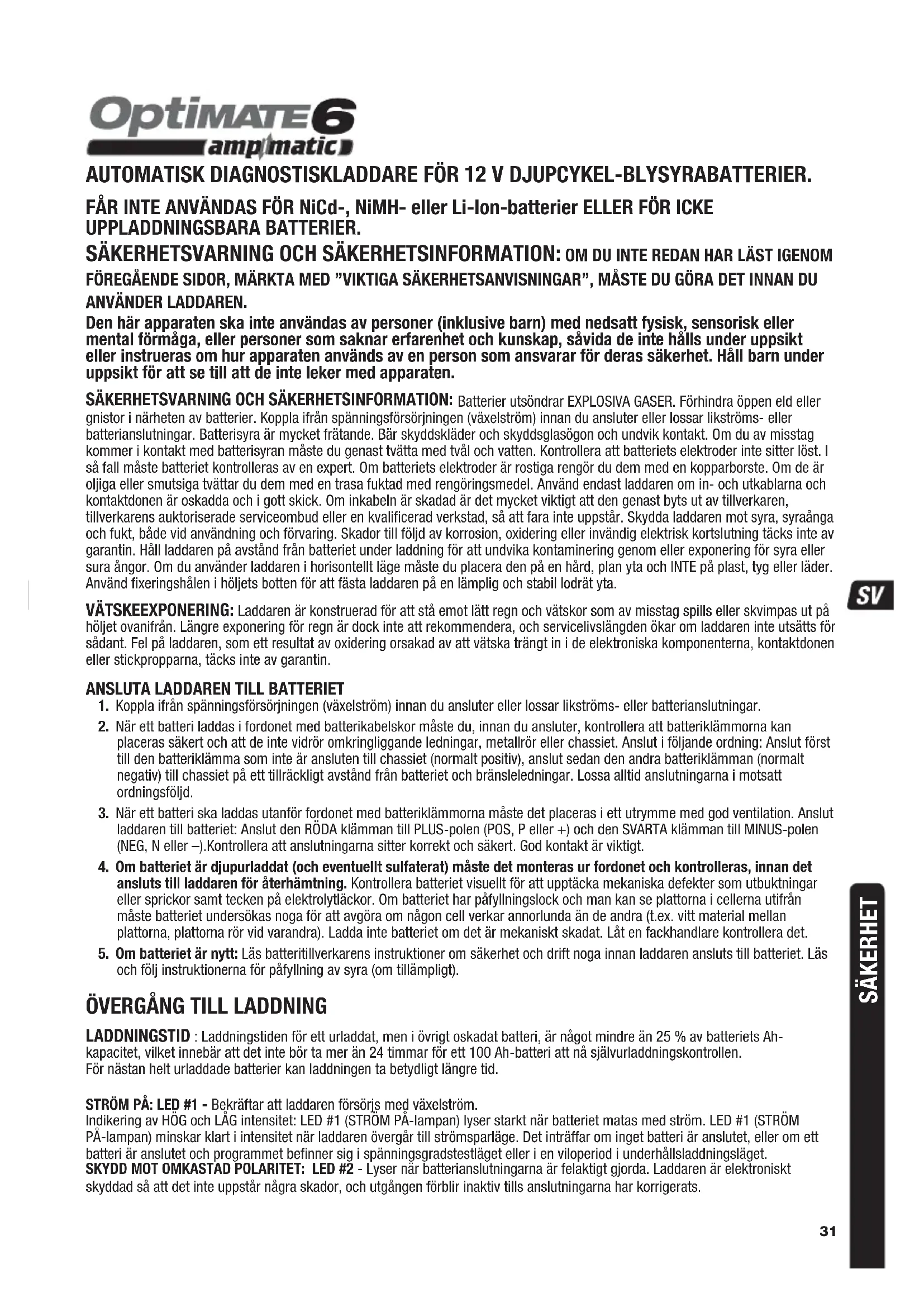 AUTOMATISK DIAGNOSTISKLADDARE FÖR 12 V DJUPCYKEL-BLYSYRABATTERIER. FÅR INTE ANVÄNDAS FÖR NiCd-, NiMH- eller Li-Ion-batterier ELLER FÖR ICKE UPPLADDNINGSBARA BATTERIER. SÄKERHETSVARNING OCH SÄKERHETSINFORMATION: OM DU INTE REDAN HAR LÄST IGENOM FÖREGÅENDE SIDOR, MÄRKTA MED ”VIKTIGA SÄKERHETSANVISNINGAR”, MÅSTE DU GÖRA DET INNAN DU ANVÄNDER LADDAREN. Den här apparaten ska inte användas av personer (inklusive barn) med nedsatt fysisk, sensorisk eller mental förmåga, eller personer som saknar erfarenhet och kunskap, såvida de inte hålls under uppsikt eller instrueras om hur apparaten används av en person som ansvarar för deras säkerhet. Håll barn under uppsikt för att se till att de inte leker med apparaten. SÄKERHETSVARNING OCH SÄKERHETSINFORMATION: Batterier utsöndrar EXPLOSIVA GASER. Förhindra öppen eld eller gnistor i närheten av batterier. Koppla ifrån spänningsförsörjningen (växelström) innan du ansluter eller lossar likströms- eller batterianslutningar. Batterisyra är mycket frätande. Bär skyddskläder och skyddsglasögon och undvik kontakt. Om du av misstag kommer i kontakt med batterisyran måste du genast tvätta med tvål och vatten. Kontrollera att batteriets elektroder inte sitter löst. I så fall måste batteriet kontrolleras av en expert. Om batteriets elektroder är rostiga rengör du dem med en kopparborste. Om de är oljiga eller smutsiga tvättar du dem med en trasa fuktad med rengöringsmedel. Använd endast laddaren om in- och utkablarna och kontaktdonen är oskadda och i gott skick. Om inkabeln är skadad är det mycket viktigt att den genast byts ut av tillverkaren, tillverkarens auktoriserade serviceombud eller en kvalificerad verkstad, så att fara inte uppstår. Skydda laddaren mot syra, syraånga och fukt, både vid användning och förvaring. Skador till följd av korrosion, oxidering eller invändig elektrisk kortslutning täcks inte av garantin. Håll laddaren på avstånd från batteriet under laddning för att undvika kontaminering genom eller exponering för syra eller sura ångor. Om du använder laddaren i horisontellt läge måste du placera den på en hård, plan yta och INTE på plast, tyg eller läder. Använd fixeringshålen i höljets botten för att fästa laddaren på en lämplig och stabil lodrät yta. VÄTSKEEXPONERING: Laddaren är konstruerad för att stå emot lätt regn och vätskor som av misstag spills eller skvimpas ut på höljet ovanifrån. Längre exponering för regn är dock inte att rekommendera, och servicelivslängden ökar om laddaren inte utsätts för sådant. Fel på laddaren, som ett resultat av oxidering orsakad av att vätska trängt in i de elektroniska komponenterna, kontaktdonen eller stickpropparna, täcks inte av garantin.