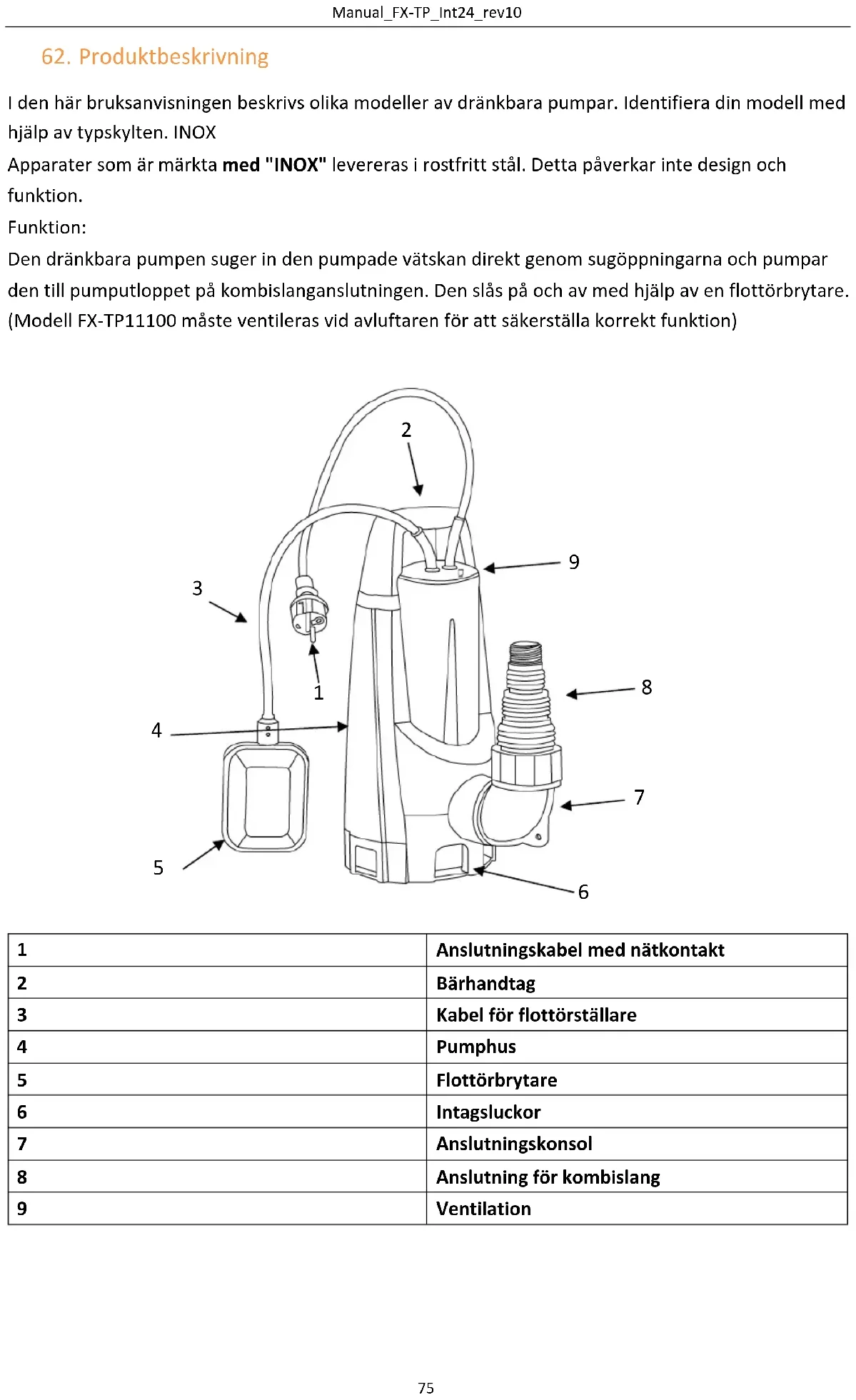I den här bruksanvisningen beskrivs olika modeller av dränkbara pumpar. Identifiera din modell med hjälp av typskylten. INOX Apparater som är märkta med "INOX" levereras i rostfritt stål. Detta påverkar inte design och funktion. Funktion: Den dränkbara pumpen suger in den pumpade vätskan direkt genom sugöppningarna och pumpar den till pumputloppet på kombislanganslutningen. Den slås på och av med hjälp av en flottörbrytare. (Modell FX-TP11100 måste ventileras vid avluftaren för att säkerställa korrekt funktion)