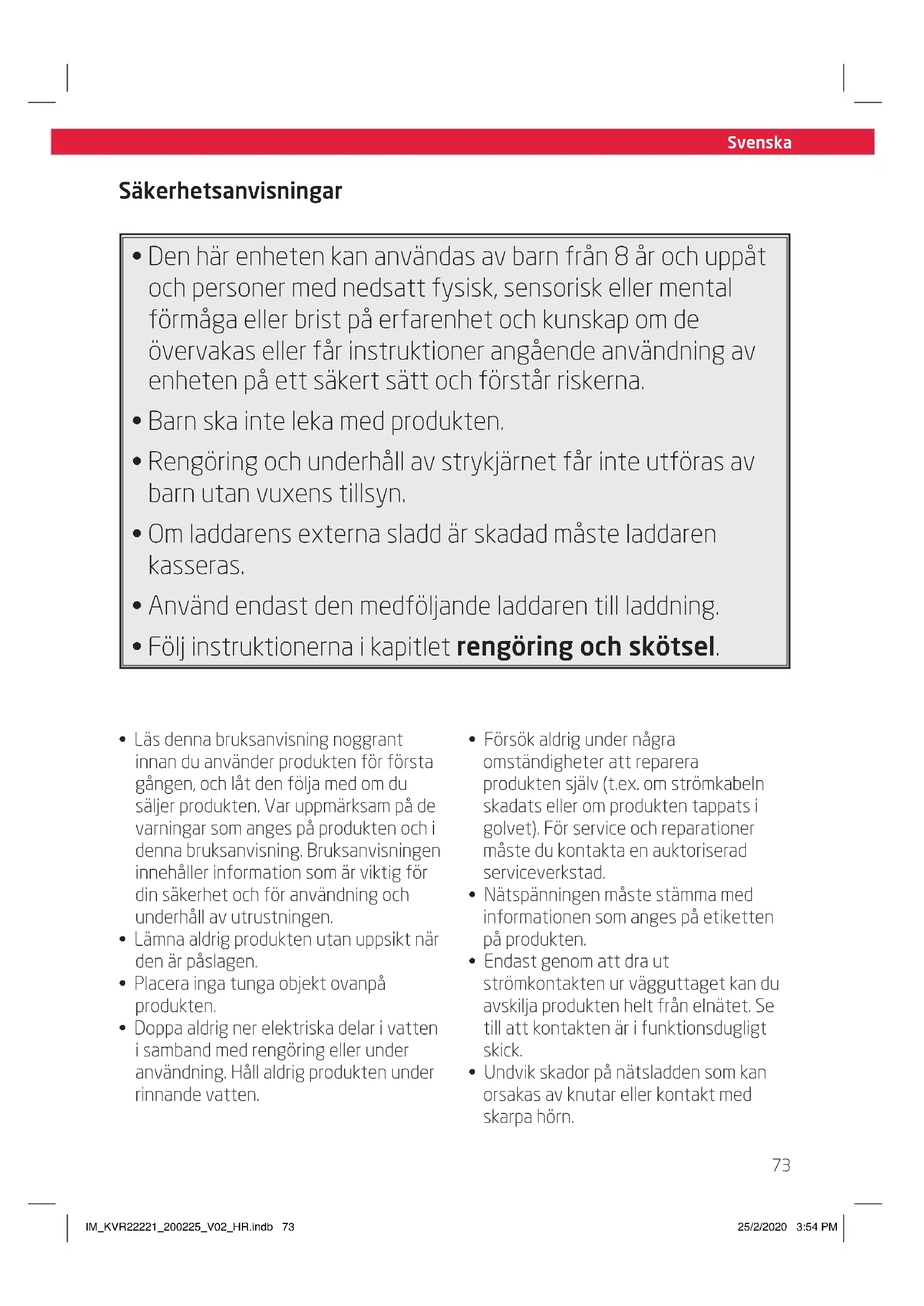 - Rengöring och underhåll av strykjärnet får inte utföras av barn utan vuxens tillsyn.