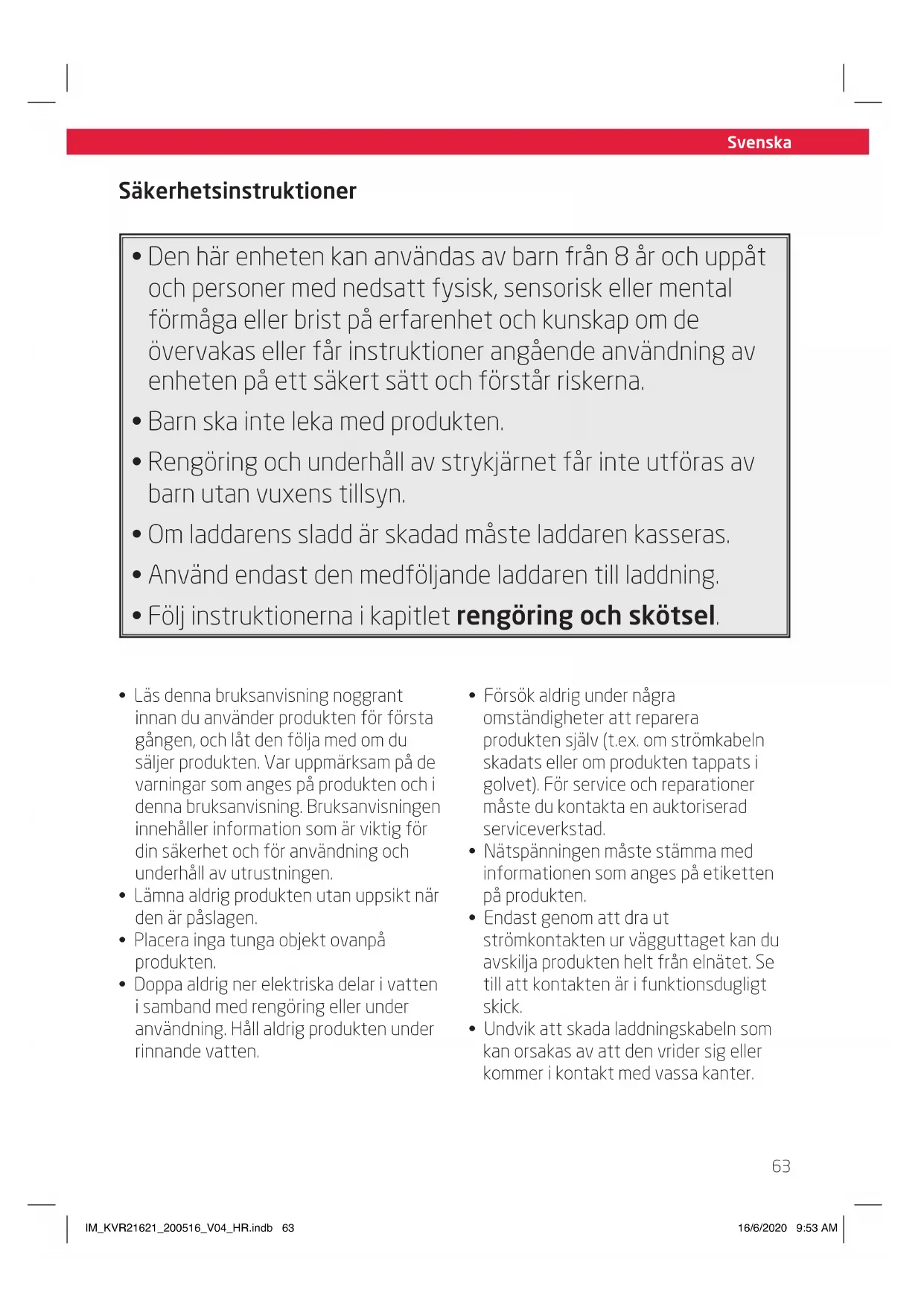 - Undvik att skada laddningskabeln som kan orsakas av att den vrider sig eller kommer i kontakt med vassa kanter. IM_KVR21621_200516_V04_HR.indb 63IM_KVR21621_200516_V04_HR.indb 63 16/6/2020 9:53 AM16/6/2020 9:53 AMSize - A5 Svenska