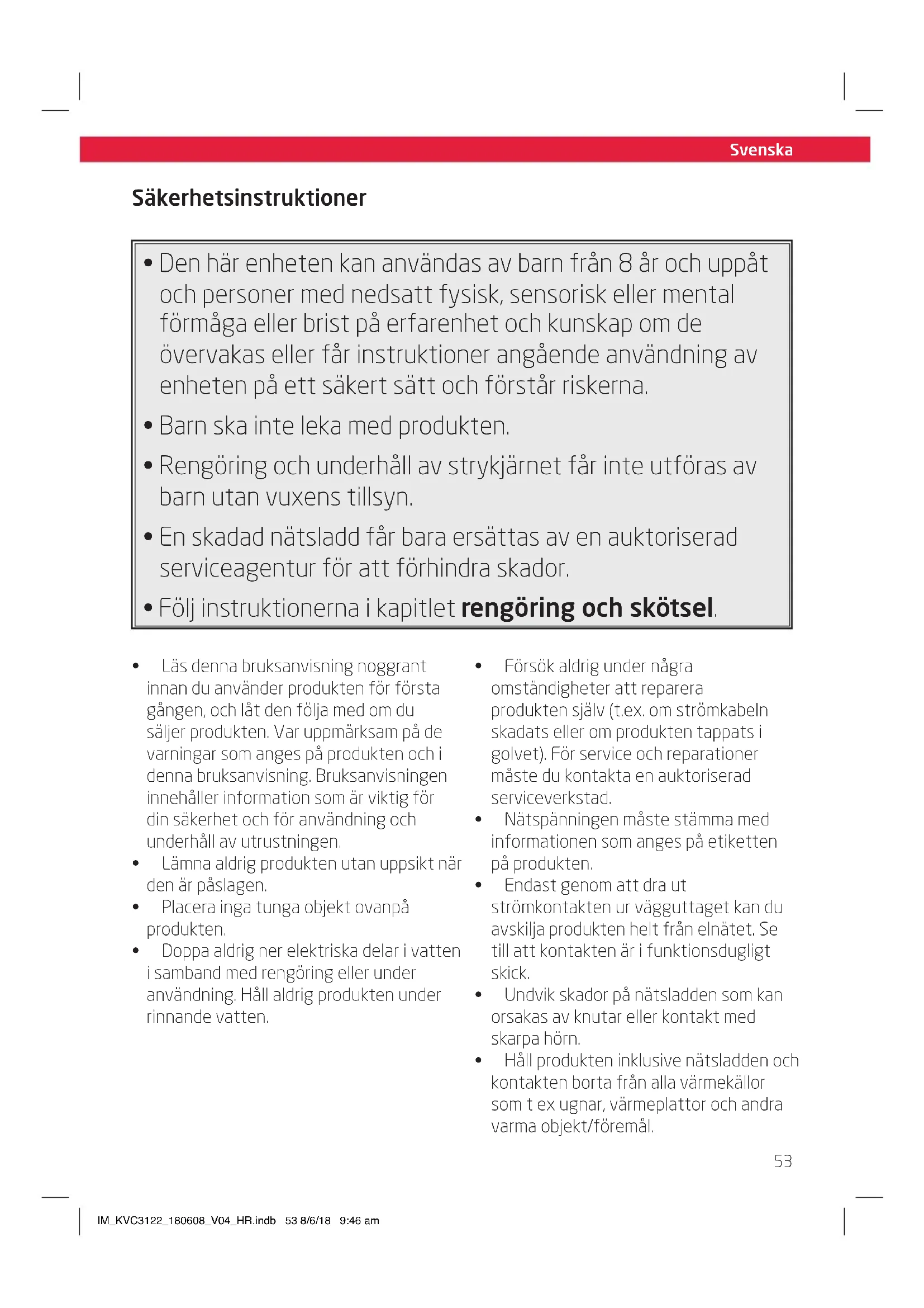 - Håll produkten inklusive nätsladden och kontakten borta från alla värmekällor som t ex ugnar, värmeplattor och andra varma objekt/föremål. IM_KVC3122_180608_V04_HR.indb 53 8/6/18 9:46 amSize - A5 Svenska