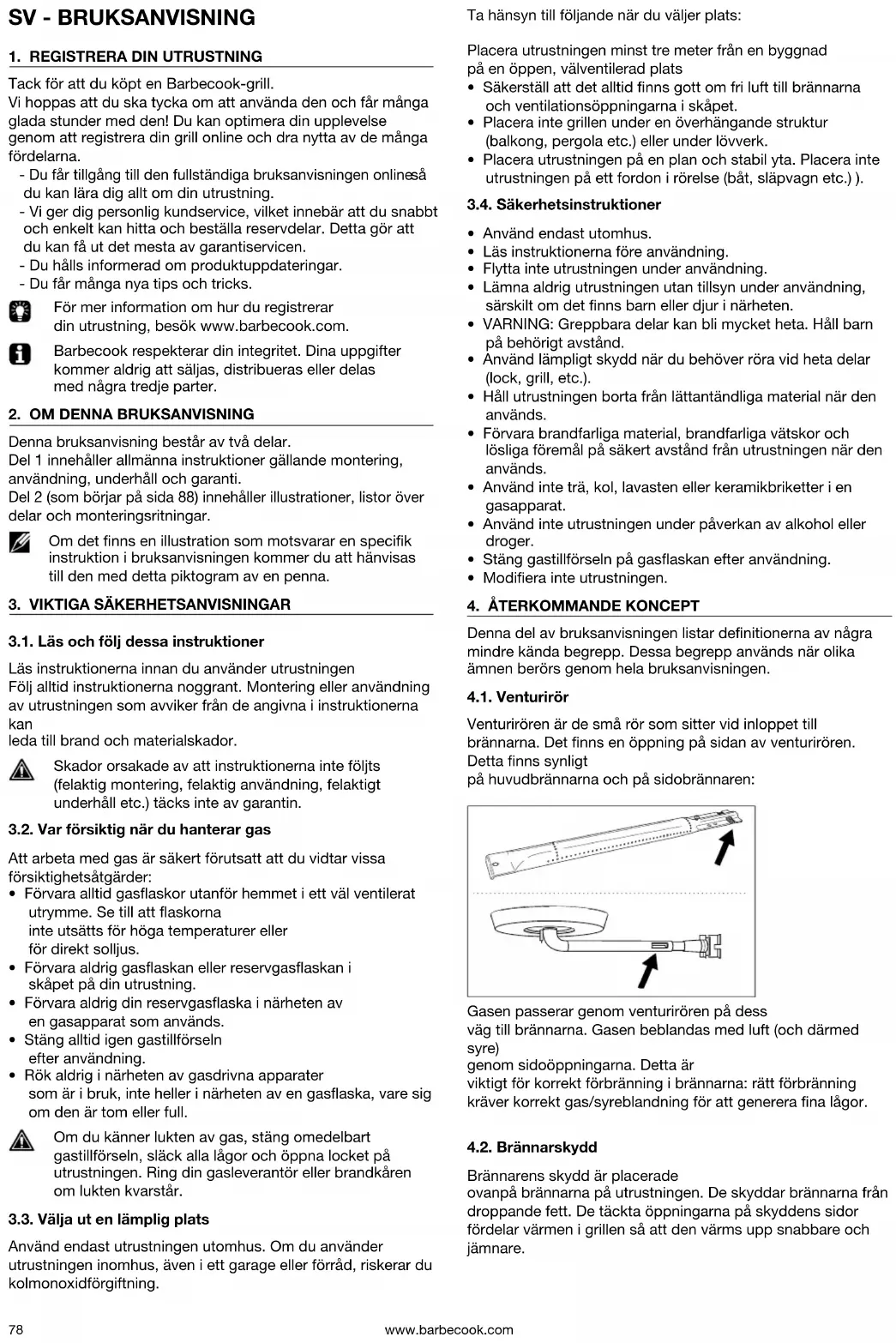 Denna del av bruksanvisningen listar denitionerna av några mindre kända begrepp. Dessa begrepp används när olika ämnen berörs genom hela bruksanvisningen. 4.1. Venturirör Venturirören är de små rör som sitter vid inloppet till brännarna. Det nns en öppning på sidan av venturirören. Detta nns synligt på huvudbrännarna och på sidobrännaren: Gasen passerar genom venturirören på dess väg till brännarna. Gasen beblandas med luft (och därmed syre) genom sidoöppningarna. Detta är viktigt för korrekt förbränning i brännarna: rätt förbränning kräver korrekt gas/syreblandning för att generera na lågor. 4.2. Brännarskydd Brännarens skydd är placerade ovanpå brännarna på utrustningen. De skyddar brännarna från droppande fett. De täckta öppningarna på skyddens sidor fördelar värmen i grillen så att den värms upp snabbare och jämnare.www.barbecook.com