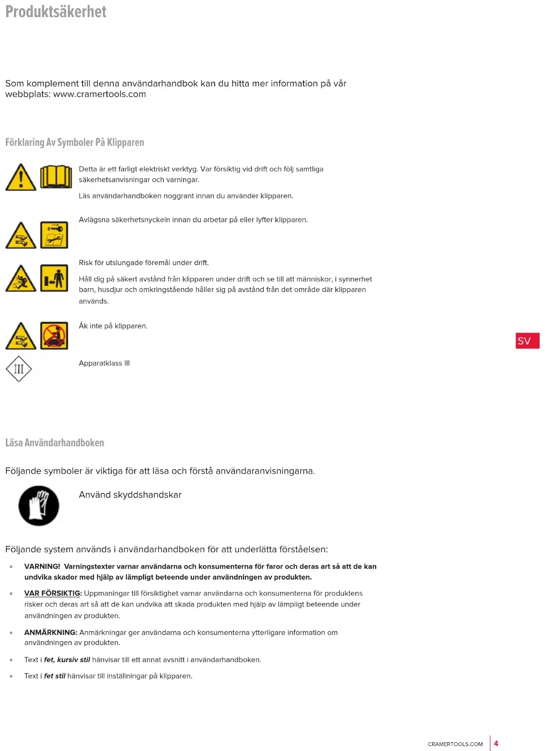 Förklaring Av Symboler På Klipparen Detta är ett farligt elektriskt verktyg. Var försiktig vid drift och följ samtliga säkerhetsanvisningar och varningar. Läs användarhandboken noggrant innan du använder klipparen. Avlägsna säkerhetsnyckeln innan du arbetar på eller lyfter klipparen. Risk för utslungade föremål under drift. Håll dig på säkert avstånd från klipparen under drift och se till att människor, i synnerhet barn, husdjur och omkringstående håller sig på avstånd från det område där klipparen används. Åk inte på klipparen. Apparatklass III Som komplement till denna användarhandbok kan du hitta mer information på vår webbplats: www.cramertools.com Läsa Användarhandboken Följande symboler är viktiga för att läsa och förstå användaranvisningarna. Använd skyddshandskar Följande system används i användarhandboken för att underlätta förståelsen: