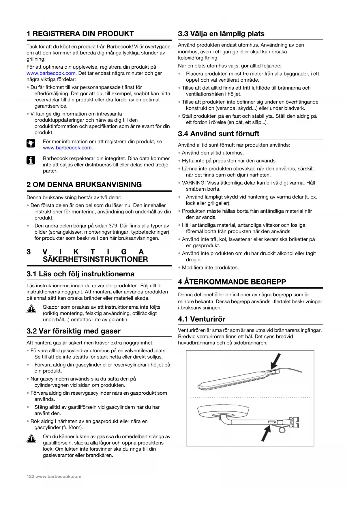 Venturirören är små rör som är anslutna vid brännarens ingångar. Bredvid venturirören finns ett hål. Det syns bredvid huvudbrännarna och på sidobrännaren: MAN_GAS_QUISSON_BBC_140730_A.book Page 122 Tuesday, February 2, 2016 4:55 PMwww.barbecook.com 123 När gasen är på väg till brännarna går den genom venturirören. Tack vare hålen på sidorna så blandas gasen med luft och därigenom blandas den med syre. Det här är nödvändigt för att ge brännarna en bra antändning: endast rätt blandning av gas och syre tänds på rätt sätt och kommer att ge fina lågor.