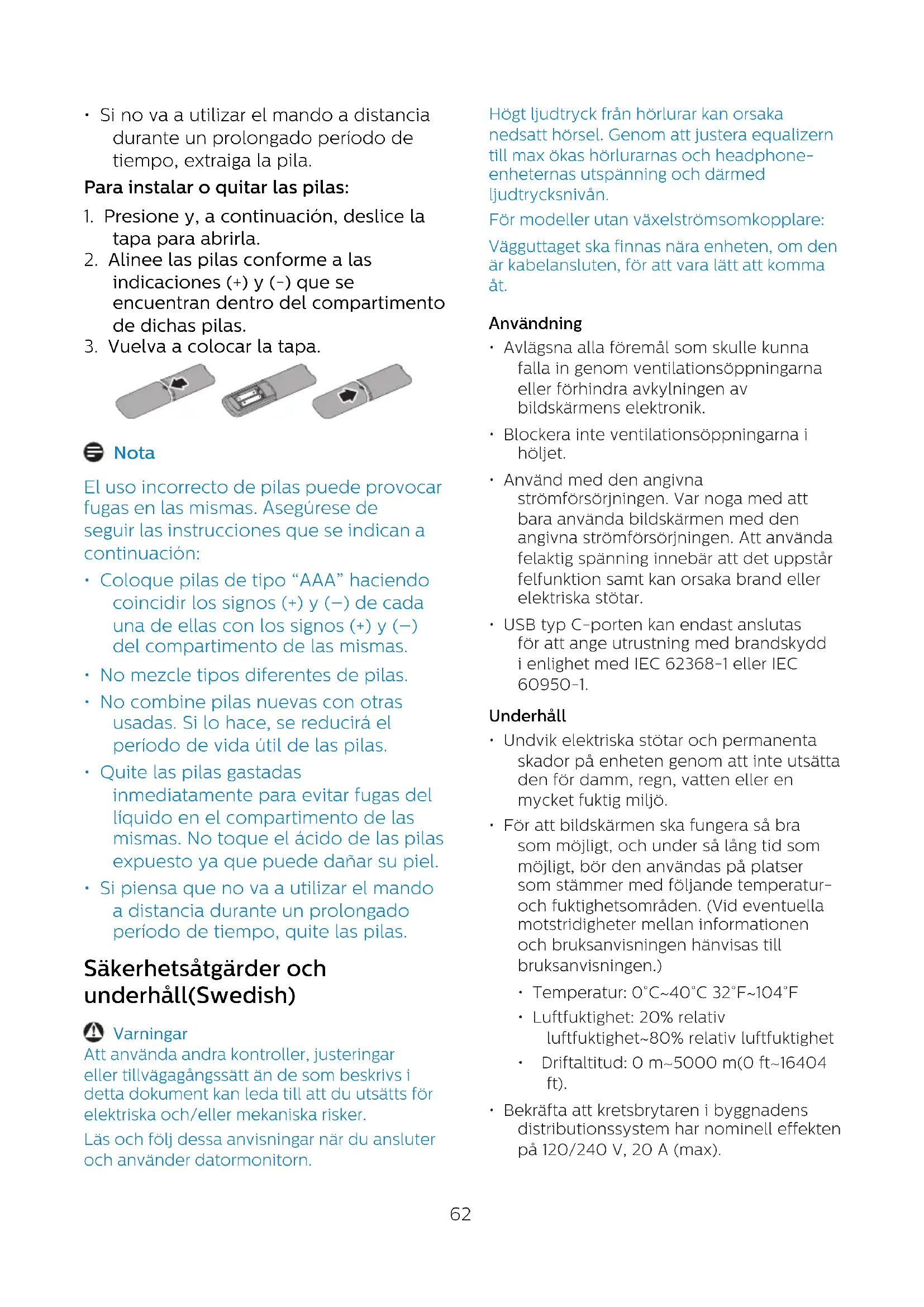 - Si piensa que no va a utilizar el mando a distancia durante un prolongado período de tiempo, quite las pilas. Säkerhetsåtgärder och underhåll(Swedish) Varningar Att använda andra kontroller, justeringar eller tillvägagångssätt än de som beskrivs i detta dokument kan leda till att du utsätts för elektriska och/eller mekaniska risker. Läs och följ dessa anvisningar när du ansluter och använder datormonitorn. Högt ljudtryck från hörlurar kan orsaka nedsatt hörsel. Genom att justera equalizern till max ökas hörlurarnas och headphone- enheternas utspänning och därmed ljudtrycksnivån. För modeller utan växelströmsomkopplare: Vägguttaget ska finnas nära enheten, om den är kabelansluten, för att vara lätt att komma åt. Användning