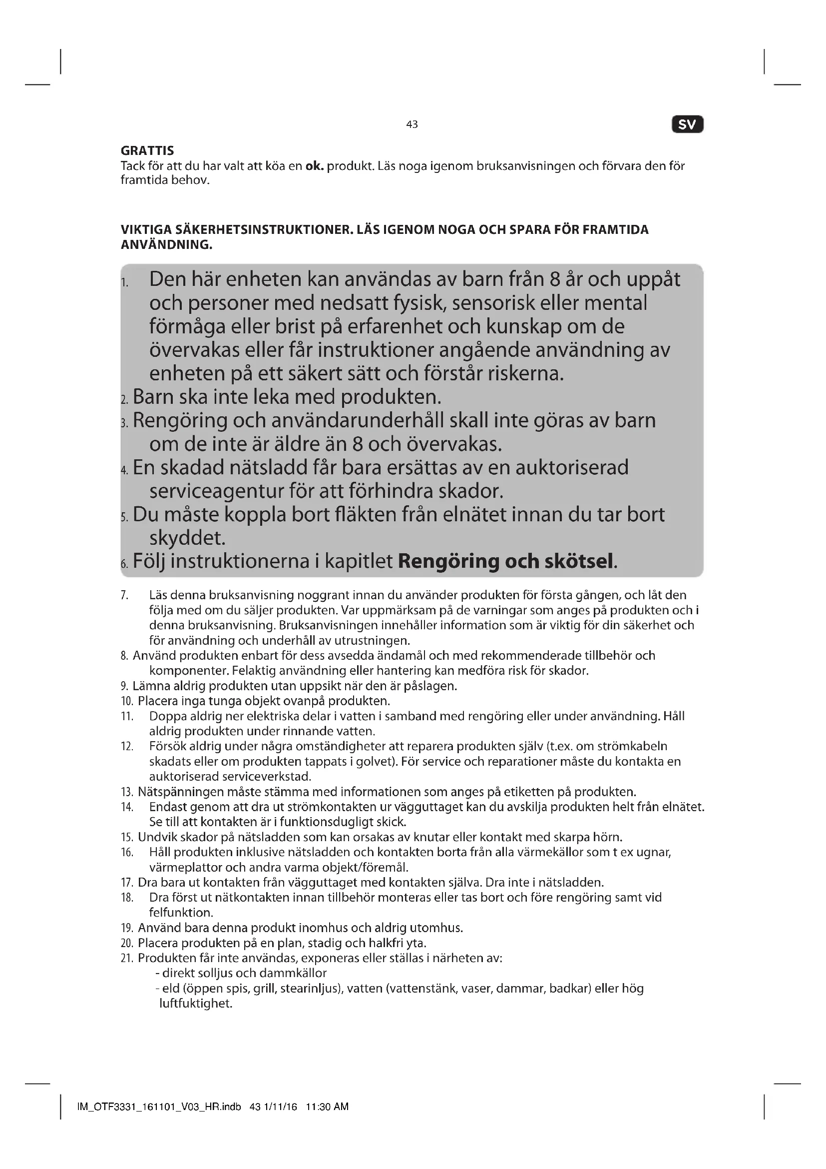 - När du har packat upp produkten, läs vidare i kapitlet Rengöring och skötsel. IM_OTF3331_161101_V03_HR.indb 44 1/11/16 11:30 AM45