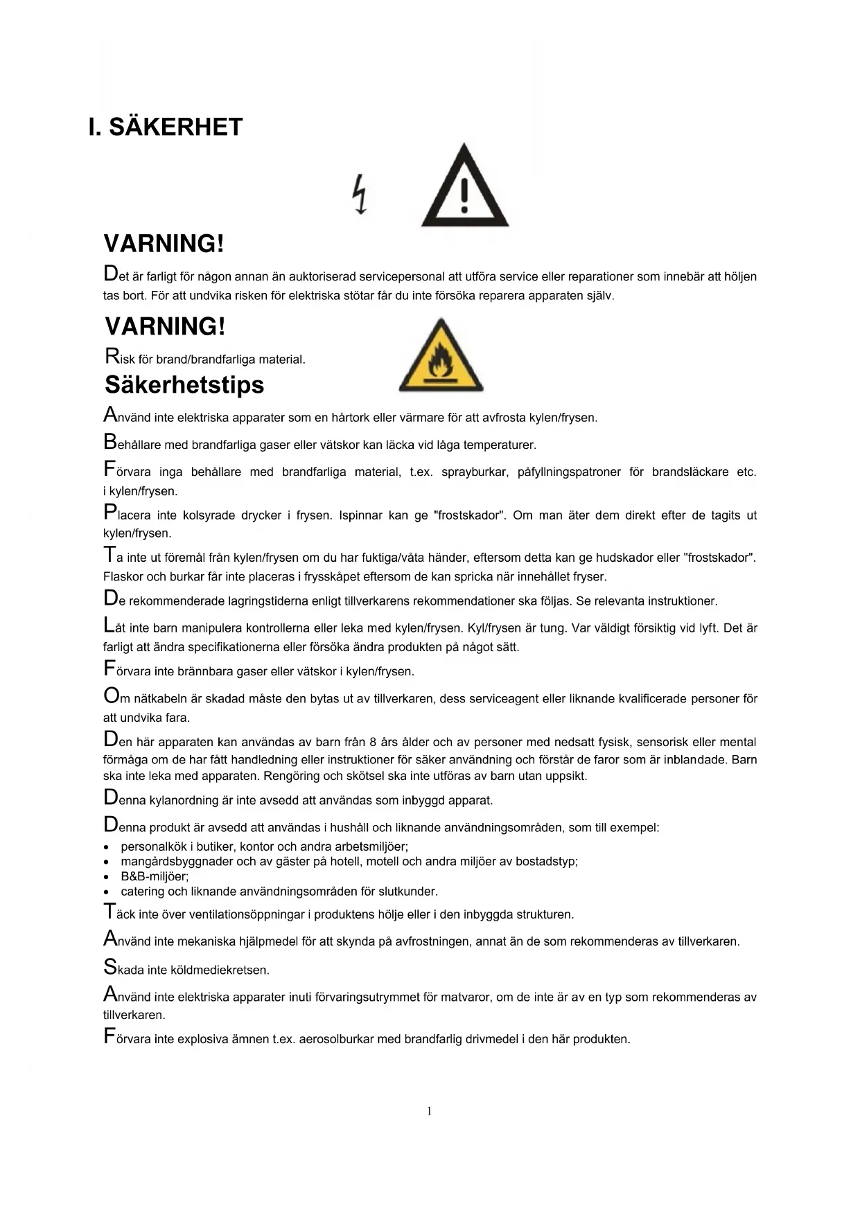 VARNING! Det är farligt för någon annan än auktoriserad servicepersonal att utföra service eller reparationer som innebär att höljen tas bort. För att undvika risken för elektriska stötar får du inte försöka reparera apparaten själv. VARNING! Risk för brand/brandfarliga material. Säkerhetstips Använd inte elektriska apparater som en hårtork eller värmare för att avfrosta kylen/frysen. Behållare med brandfarliga gaser eller vätskor kan läcka vid låga temperaturer. Förvara inga behållare med brandfarliga material, t.ex. sprayburkar, påfyllningspatroner för brandsläckare etc. i kylen/frysen. Placera inte kolsyrade drycker i frysen. Ispinnar kan ge "frostskador". Om man äter dem direkt efter de tagits ut kylen/frysen. Ta inte ut föremål från kylen/frysen om du har fuktiga/våta händer, eftersom detta kan ge hudskador eller "frostskador". Flaskor och burkar får inte placeras i frysskåpet eftersom de kan spricka när innehållet fryser. De rekommenderade lagringstiderna enligt tillverkarens rekommendationer ska följas. Se relevanta instruktioner. Låt inte barn manipulera kontrollerna eller leka med kylen/frysen. Kyl/frysen är tung. Var väldigt försiktig vid lyft. Det är farligt att ändra specifikationerna eller försöka ändra produkten på något sätt. Förvara inte brännbara gaser eller vätskor i kylen/frysen. Om nätkabeln är skadad måste den bytas ut av tillverkaren, dess serviceagent eller liknande kvalificerade personer för att undvika fara. Den här apparaten kan användas av barn från 8 års ålder och av personer med nedsatt fysisk, sensorisk eller mental förmåga om de har fått handledning eller instruktioner för säker användning och förstår de faror som är inblandade. Barn ska inte leka med apparaten. Rengöring och skötsel ska inte utföras av barn utan uppsikt. Denna kylanordning är inte avsedd att användas som inbyggd apparat. Denna produkt är avsedd att användas i hushåll och liknande användningsområden, som till exempel: