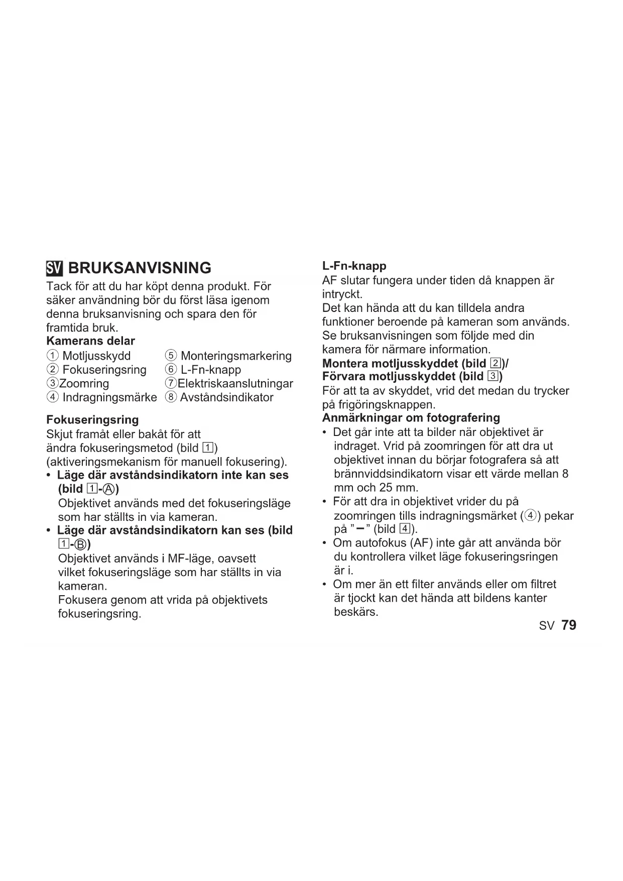 https://cs.olympus-imaging.jp/en/support/imsg/ digicamera/download/notice/notice.cfmSV 79 BRUKSANVISNING Tack för att du har köpt denna produkt. För säker användning bör du först läsa igenom denna bruksanvisning och spara den för framtida bruk. Kamerans delar 1 Motljusskydd 2 Fokuseringsring 3 Zoomring 4 Indragningsmärke 5 Monteringsmarkering 6 L-Fn-knapp 7 Elektriska anslutningar 8 Avståndsindikator Fokuseringsring Skjut framåt eller bakåt för att ändra fokuseringsmetod (bild 1) (aktiveringsmekanism för manuell fokusering).