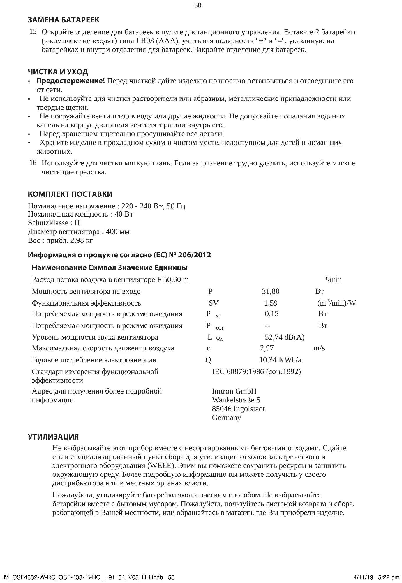 52,74 dB(A) Maximal lufthastighet c 2,97 m/s Elförbrukning säsongvis Q 10,34 KWh/a Mätstandard för driftsvärde IEC 60879:1986 (corr.1992) Kontaktuppgifter för mer information Imtron GmbH Wankelstraße 5 85046 Ingolstadt Germany AVYTTRING Denna apparat får inte kastas med hushållsavfallet. Lämna in den på återvinningsstationen för återvinning av elektroniskt och elektriskt avfall. Genom att göra detta hjälper du till att bevara resurserna och skydda miljön. Kontakta din återförsäljare eller lokala myndigheter för mer information. Gör dig av med batterierna på ett miljövänligt sätt. Släng inte batterier i hushållssoporna. Använd återvinnings och uppsamlingssystemet i din kommun eller kontakta den återförsäljare där du köpte produkten. IM_OSF4332-W-RC_OSF-433- B-RC _191104_V05_HR.indb 63 4/11/19 5:22 pm64