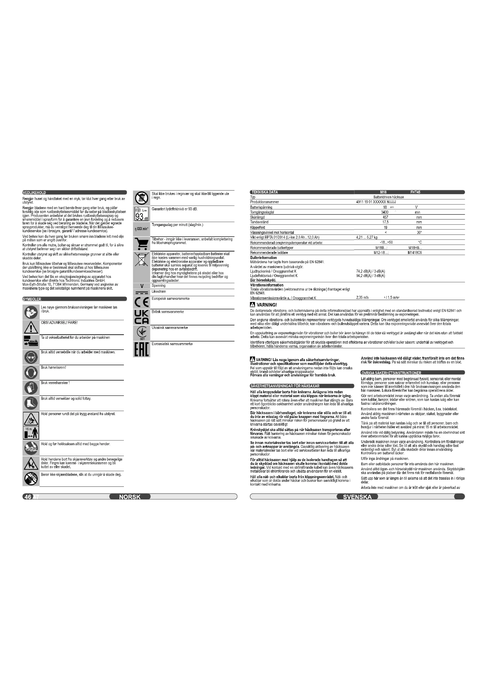 Låt aldrig barn, personer med begränsad fysiskt, sensorisk eller mental förmåga, personer som saknar erfarenhet och kunskap, eller personer som inte känner till innehållet i den här bruksanvisningen använda den här maskinen. Lokala föreskrifter kan begränsa operatörens ålder. Gör rent arbetsområdet innan varje användning. Ta undan alla föremål som kablar, lampor, trådar eller snören, som kan kastas iväg eller kan fastna i skäranordningen. Kontrollera om det fi nns främmade föremål i häcken, t.ex. trådstaket. Använd aldrig maskinen i närheten av stolpar, staket, byggnader eller andra fasta föremål. Tänk på att material kan kastas iväg och se till att personer, barn och husdjur i närheten håller ett avstånd på minst 15 m till arbetsområdet. Använd inte vid dålig belysning. Användaren måste ha en obehindrad sikt över arbetsområdet för att kunna upptäcka möjliga faror. Undersök maskinen innan varje användning. Kontrollera om förslutningar eller andra delar sitter löst. Se till att alla skydd och handtag sitter fast ordentligt och säkert. Byt ut alla skadade delar innan användning. Kontrollera om batteriet läcker. Utför inga ändringar på maskinen. Barn eller outbildade personer får inte använda den här maskinen. Använd alltid ögon- och hörselskydd när maskinen används. Skyddshjälm ska användas på platser där det fi nns risk för nedfallande föremål. Sätt upp hår som är längre än till axlarna så att det inte trasslas in i rörliga delar. Arbeta inte med maskinen om du är trött eller sjuk eller är påverkad av VARNING! De deklarerade vibrations- och bullernivåerna på detta informationsblad har uppmätts i enlighet med en standardiserad testmetod enligt EN 62841 och kan användas för att jämföra ett verktyg med ett annat. Det kan användas för en preliminär bedömning av exponeringen. Den angivna vibrations- och bullernivån representerar verktygets huvudsakliga tillämpningar. Om verktyget emellertid används för olika tillämpningar, med olika eller dåligt underhållna tillbehör, kan vibrations- och bullerutsläppet variera. Detta kan öka exponeringsnivån avsevärt över den totala arbetsperioden. En uppskattning av exponeringsnivån för vibrationer och buller bör även ta hänsyn till de tider då verktyget är avstängt eller när det körs utan att faktiskt arbeta. Detta kan avsevärt minska exponeringsnivån över den totala arbetsperioden. Identifi era ytterligare säkerhetsåtgärder för att skydda operatören mot eff ekterna av vibrationer och/eller buller såsom: underhåll av verktyget och tillbehören, hålla händerna varma, organisation av arbetsmönster. VEDLIKEHOLD Rengjør huset og håndtaket med en myk, tør klut hver gang etter bruk av utstyret. Rengjør bladene med en hard børste hver gang etter bruk, og påfør forsiktig olje som rustbeskyttelsesmiddel før du setter på bladbeskyttelsen igjen. Produsenten anbefaler at det brukes rustbeskyttelsesspray og smøremiddel i sprayform for å garantere en jevn fordeling og å redusere faren for å skade seg ved berøring av bladene. Når det gjelder egnede sprayprodukter, må du vennligst henvende deg til din Milwaukee- kundeservice (se i brosjyre, garanti/ / adresse kundeservice). Ved behov kan du hver gang før bruken smøre inn bladene lett med olje på måten som er angitt ovenfor. Kontroller om alle mutre, bolter og skruer er strammet godt til, for å sikre at utstyret befi nner seg i en sikker driftstilstand. Kontroller utstyret og skift av sikkerhetsmessige grunner ut slitte eller skadde deler. Bruk kun Milwaukee tilbehør og Milwaukee reservedeler. Komponenter der utskiftning ikke er beskrevet skal skiftes ut hos Milwaukee kundeservice (se brosjyre garanti/kundeserviceadresser). Ved behov kan det fås en eksplosjonstegning av apparatet hos kundeservice eller direkte hos Techtronic Industries GmbH, Max-Eyth-Straße 10, 71364 Winnenden, Germany ved angivelse av maskinens type og det sekstallige nummeret på maskinens skilt. SYMBOLER Les nøye gjennom bruksanvisningen før maskinen tas i bruk. OBS! ADVARSEL! FARE! Ta ut vekselbatteriet før du arbeider på maskinen Bruk alltid vernebrille når du arbeider med maskinen. Bruk hørselsvern! Bruk vernehansker ! Bruk alltid verneklær og solid fottøy. Hold personer rundt det på trygg avstand fra utstyret. Hold og før hekksaksen alltid med begge hender. Hold hendene bort fra skjæreverktøy og andre bevegelige deler. Fingre kan komme i skjæremekanismen og bli kuttet av eller skadet. Berør ikke skjærebladene, slik at du unngår å skade deg. Skal ikke brukes i regnvær og skal ikke bli liggende ute i regn.