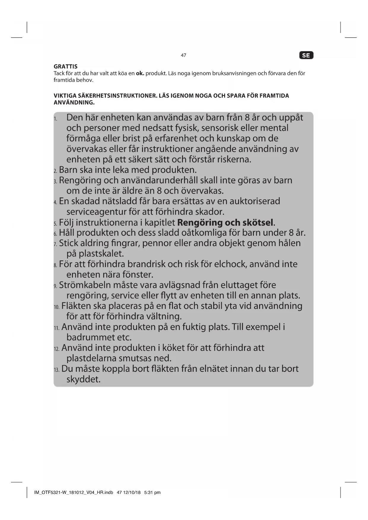 GRATTIS Tack för att du har valt att köa en ok. produkt. Läs noga igenom bruksanvisningen och förvara den för framtida behov. VIKTIGA SÄKERHETSINSTRUKTIONER. LÄS IGENOM NOGA OCH SPARA FÖR FRAMTIDA ANVÄNDNING.