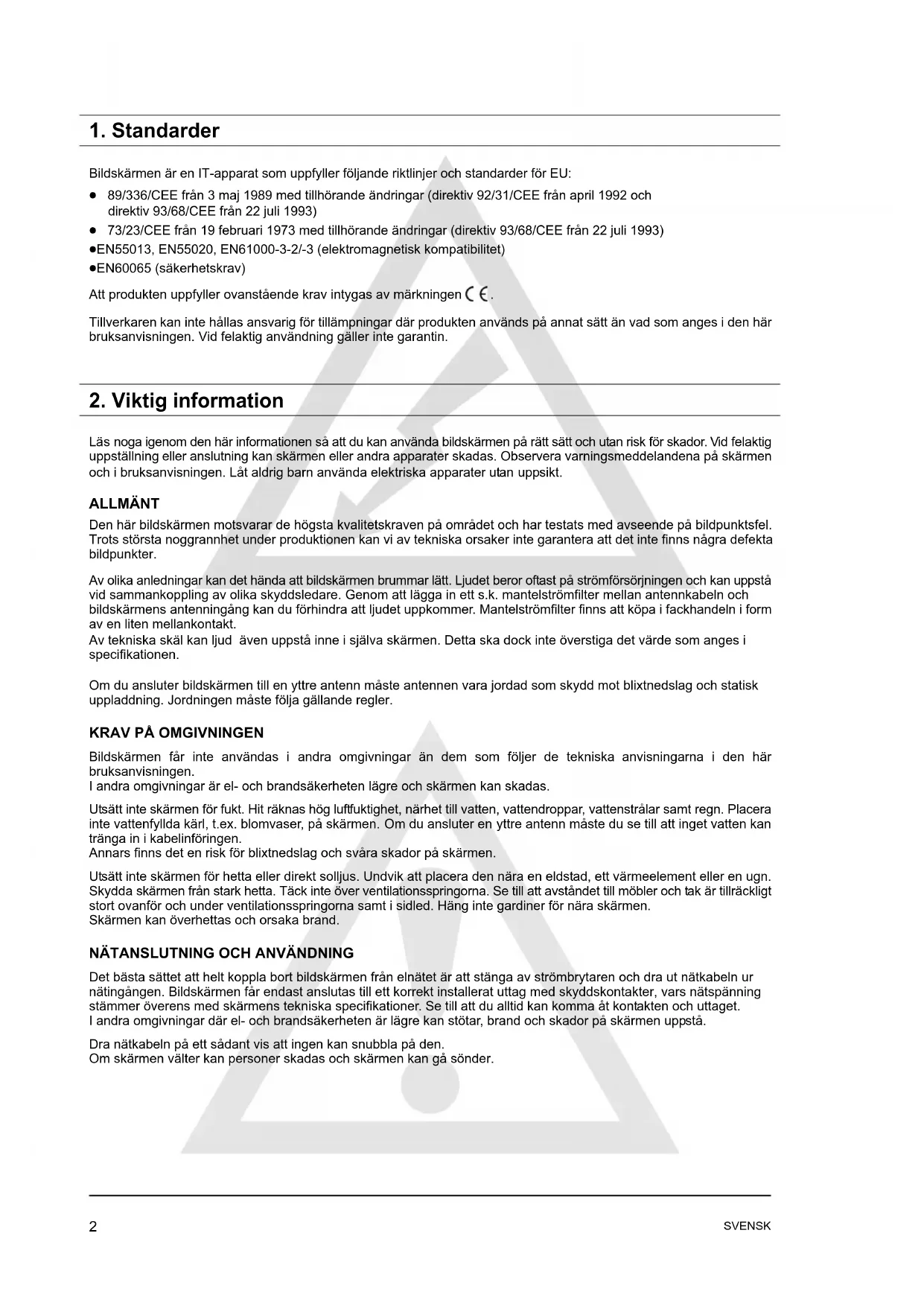 Läs noga igenom den här informationen så att du kan använda bildskärmen på rätt sätt och utan risk för skador. Vid felaktig uppställning eller anslutning kan skärmen eller andra apparater skadas. Observera varningsmeddelandena på skärmen och i bruksanvisningen. Låt aldrig barn använda elektriska apparater utan uppsikt. ALLMÄNT Den här bildskärmen motsvarar de högsta kvalitetskraven på området och har testats med avseende på bildpunktsfel. Trots största noggrannhet under produktionen kan vi av tekniska orsaker inte garantera att det inte finns några defekta bildpunkter. Av olika anledningar kan det hända att bildskärmen brummar lätt. Ljudet beror oftast på strömförsörjningen och kan uppstå vid sammankoppling av olika skyddsledare. Genom att lägga in ett s.k. mantelströmfilter mellan antennkabeln och bildskärmens antenningång kan du förhindra att ljudet uppkommer. Mantelströmfilter finns att köpa i fackhandeln i form av en liten mellankontakt. Av tekniska skäl kan ljud även uppstå inne i själva skärmen. Detta ska dock inte överstiga det värde som anges i specifikationen. Om du ansluter bildskärmen till en yttre antenn måste antennen vara jordad som skydd mot blixtnedslag och statisk uppladdning. Jordningen måste följa gällande regler.