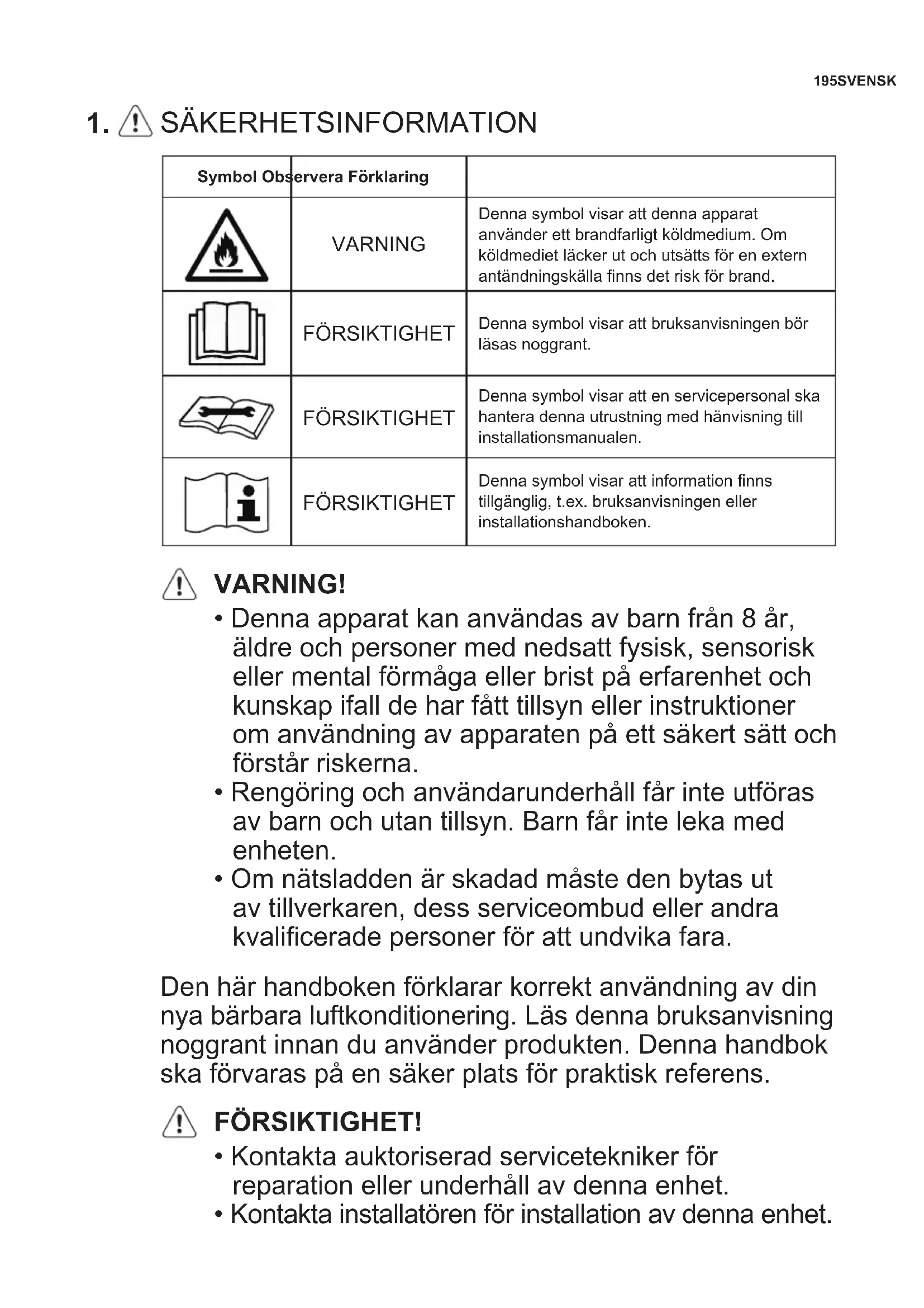 - Om nätsladden är skadad måste den bytas ut av tillverkaren, dess serviceombud eller andra kvalicerade personer för att undvika fara. Den här handboken förklarar korrekt användning av din nya bärbara luftkonditionering. Läs denna bruksanvisning noggrant innan du använder produkten. Denna handbok ska förvaras på en säker plats för praktisk referens. FÖRSIKTIGHET!