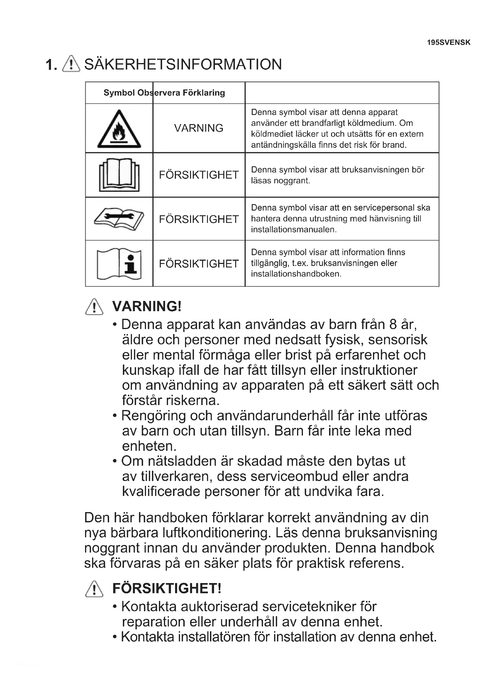 - Kontakta installatören för installation av denna enhet. Symbol Observera Förklaring VARNING Denna symbol visar att denna apparat använder ett brandfarligt köldmedium. Om köldmediet läcker ut och utsätts för en extern antändningskälla nns det risk för brand. FÖRSIKTIGHET Denna symbol visar att bruksanvisningen bör läsas noggrant. FÖRSIKTIGHET Denna symbol visar att en servicepersonal ska hantera denna utrustning med hänvisning till installationsmanualen. FÖRSIKTIGHET Denna symbol visar att information nns tillgänglig, t.ex. bruksanvisningen eller installationshandboken.196 www.electrolux.com FÖRSIKTIGHET! Varningar för användning